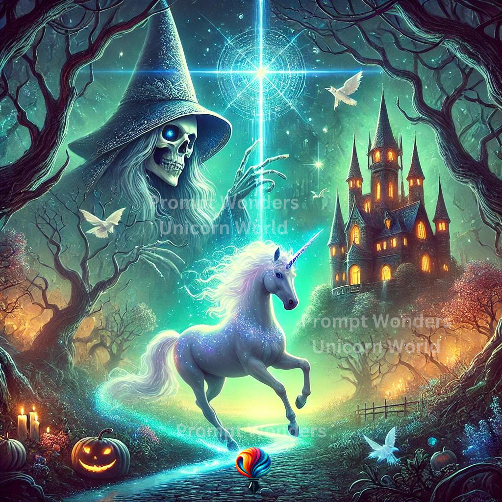 - Enchanting depiction of a unicorn breaking a witch's curse in a haunted forest