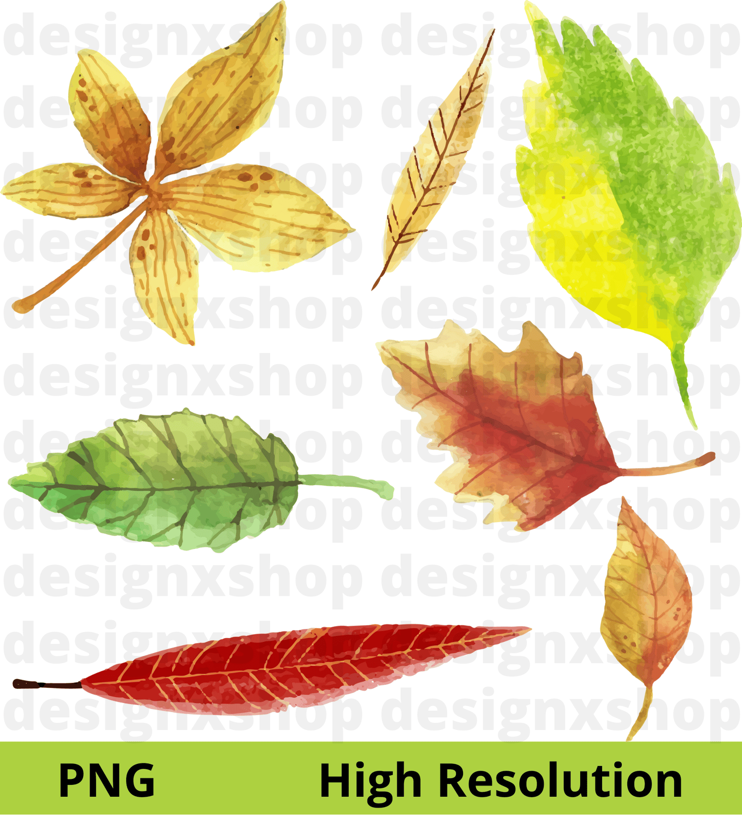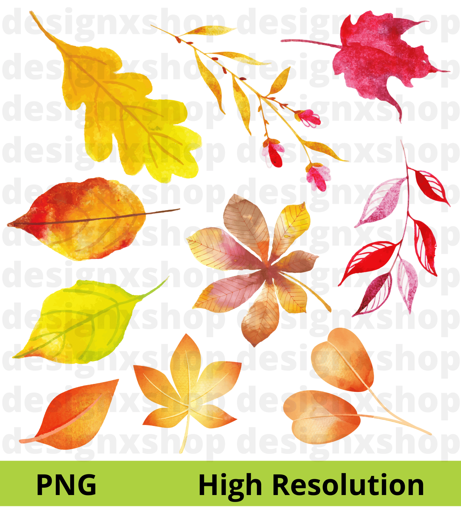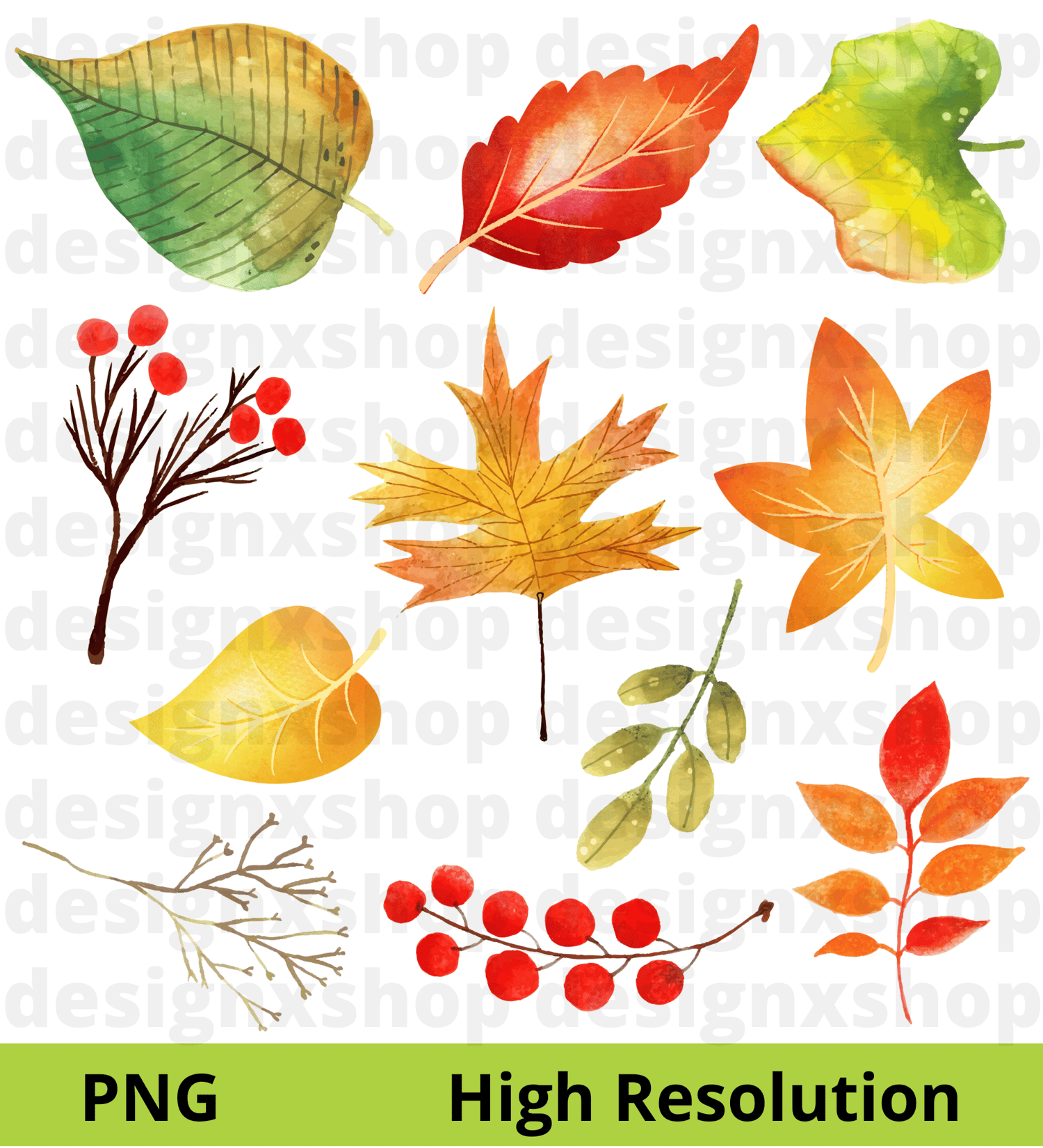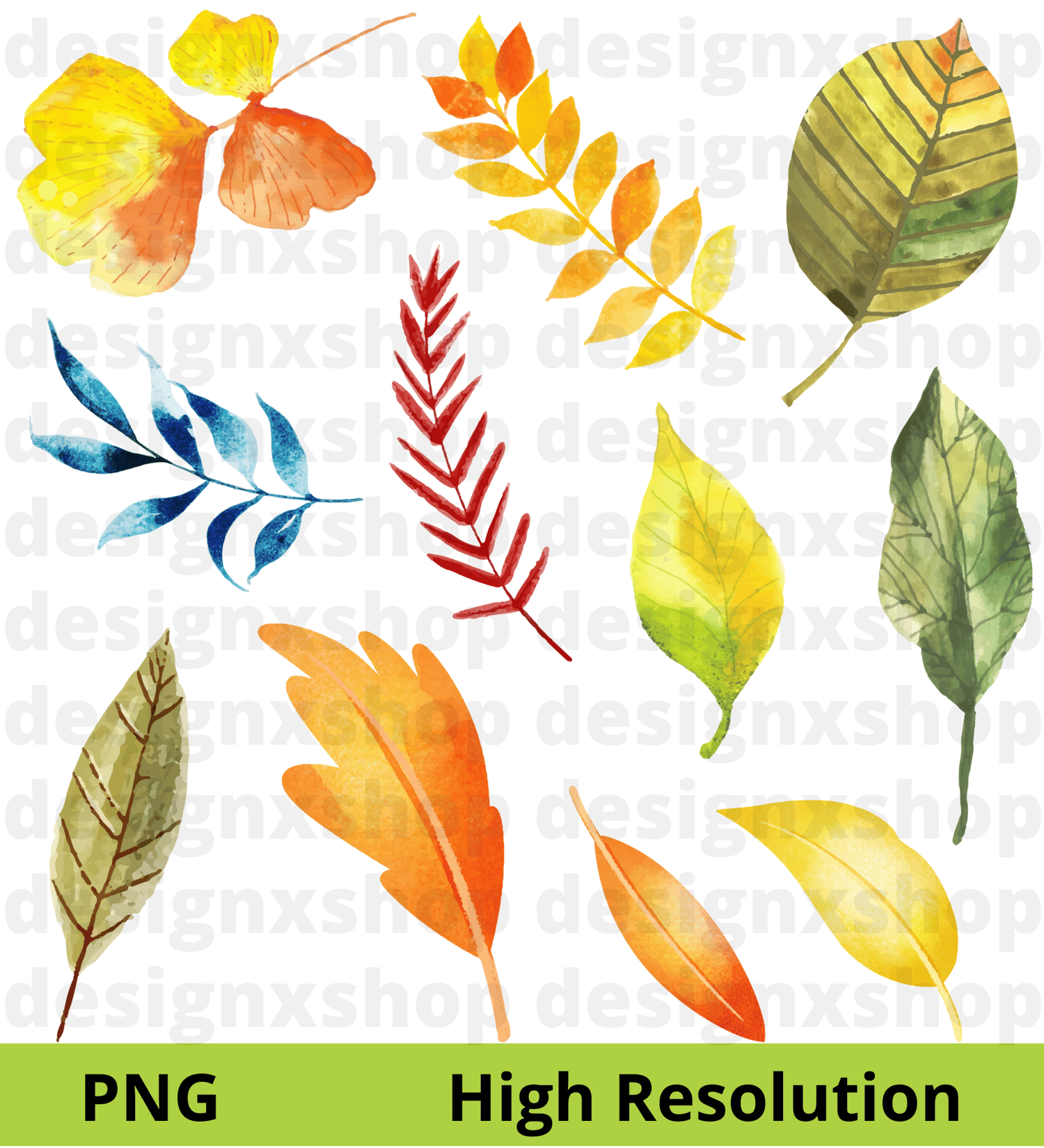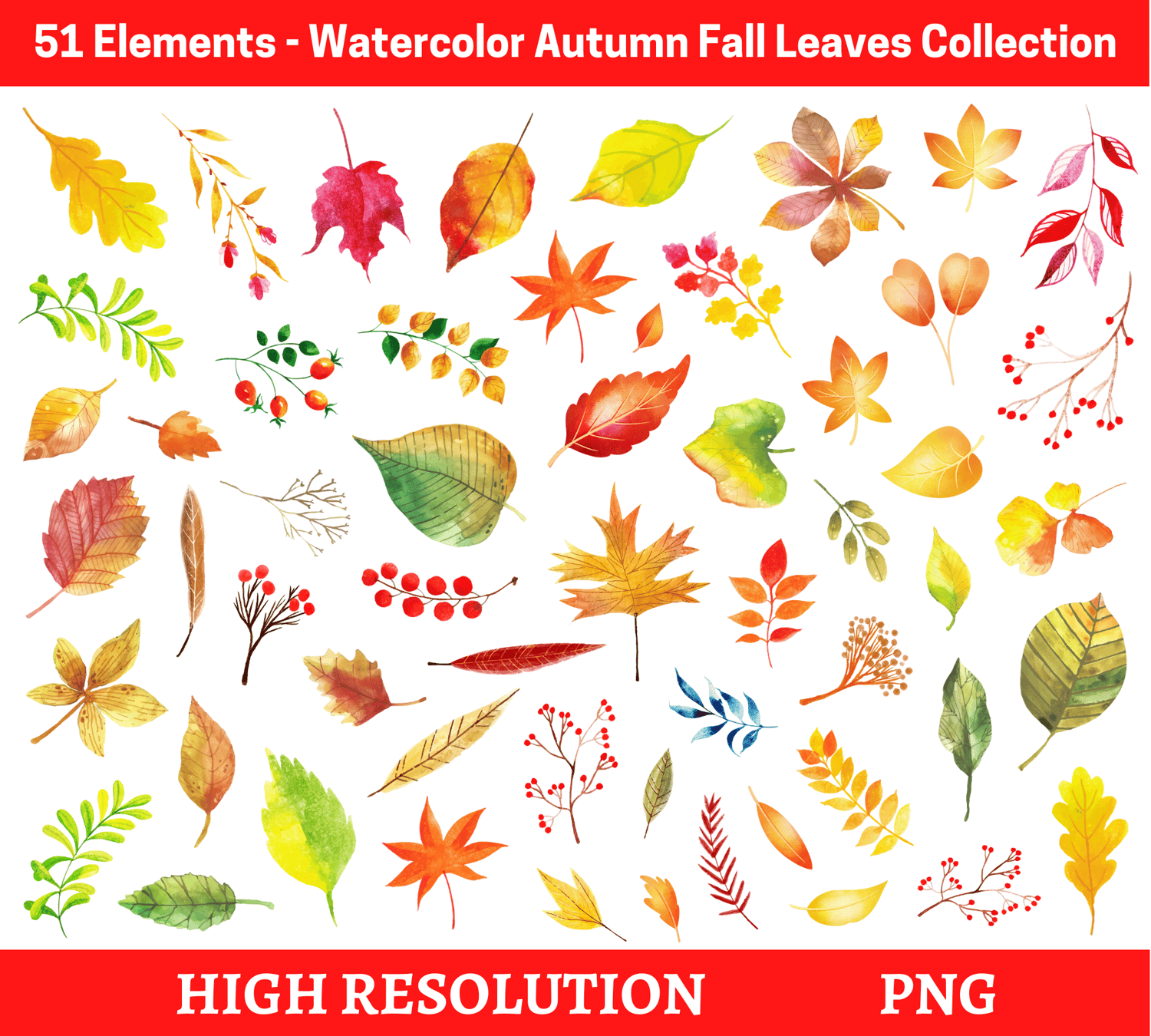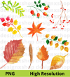 51 Elements - Watercolor Autumn Leaves Collection, hi-res digital CLIP ART (with transparent background).