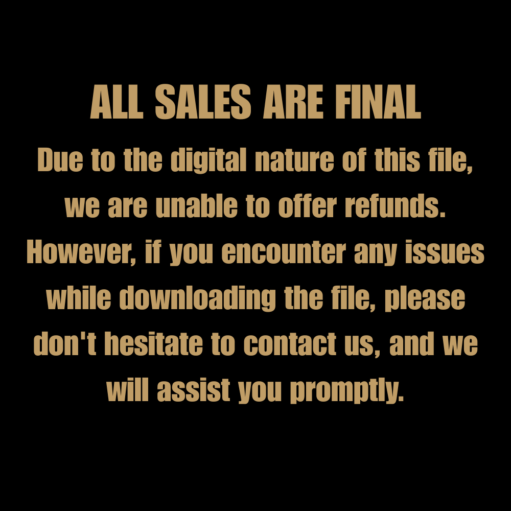 Due to the digital nature of this file, we are unable to offer refunds. However, if you encounter any issues while downloading the file, please don't hesitate to contact us, and we will assist you promptly.