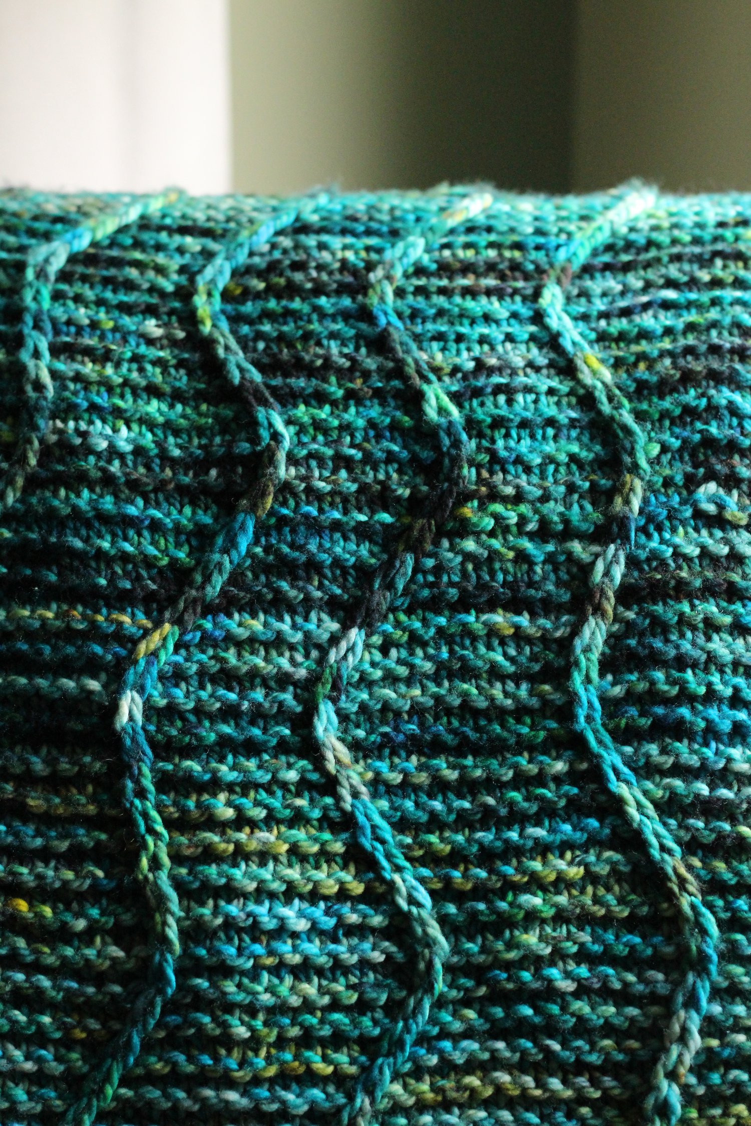 The first version of this pattern was designed in the fall of 2021, but at that inexperienced stage of my design career, I worked a background of reverse stockinette instead of garter, and the edges curled horribly. I tried every possible blocking method to get it to lie flat, but to no avail. Eventually, I frogged the whole thing and let the yarn lie in my stash for almost two years while I got over my frustration.