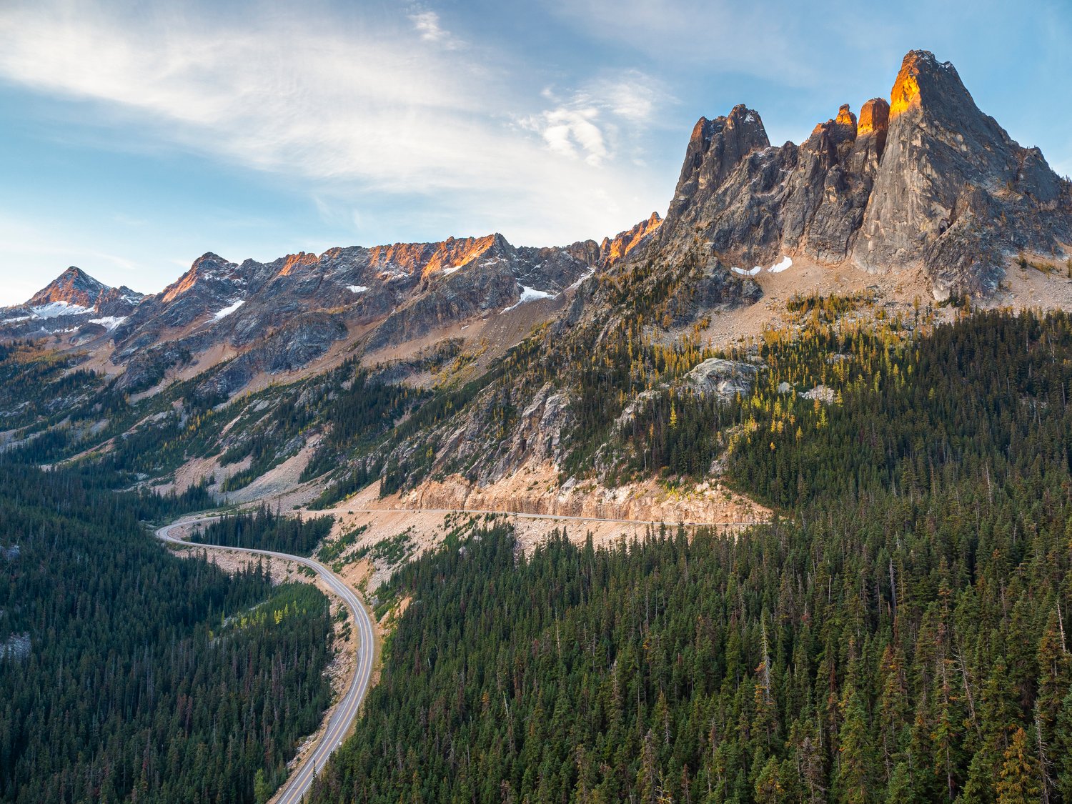 This is an images of the imposing towers of the Liberty Bell Group in Washington Pass in the North Cascades. These mountains are near the highway, but it still feels like a rugged and remote area. It's a scenic area and a great destination for rock climbing. This picture was captured at sunrise just as the sun hit the top of the peaks, giving an impressive alpine glow.