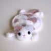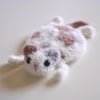 The Kitty Mug Rug is a cute calico cat cup coaster! It is nearly no-sew, only requiring sewing for the head to the body. This sweet kitten pattern features a circle coaster, making it both a functional desk buddy and cute office decor. It makes a great emotional support stuffie, birthday gift, baby shower gift, Christmas holiday gift or market/craft fair product. This pattern was designed with faux fur yarn (Feels Like Bliss from Lion Brand Yarns) for a soft and furry stuffed animal. Blanket yarn or chenille velvet yarn can also be used for a plush look. This pattern is recommended for intermediate crocheters, especially if following with the calico cat color changes.