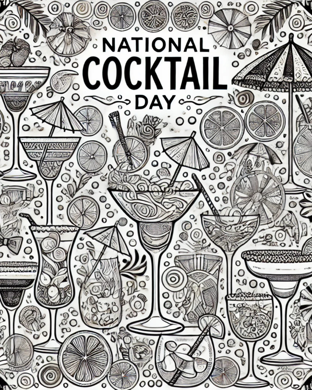 This fun and festive National Cocktail Day coloring sheet features a variety of cocktail glasses, fruity garnishes, and party-themed elements—perfect for a relaxing evening of coloring with a friend. Whether you're sipping a classic martini or a refreshing mocktail, this detailed black and white design adds an artistic twist to your celebration.
