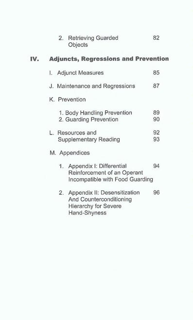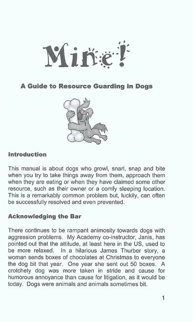 A practical how-to guide on resource guarding - food bowl, object, bed, crate, owner, etc. - in dogs. Contents include: aggression basics, nature of resource guarding, kinds of resource guarding, behaviorist vs. medical models, recognizing guarding, prognosis, safety tools, treatment overview, management, desensitization and counterconditioning, resource sample hierarchies, generalization, troubleshooting, body handling desensitization, operant conditioning.