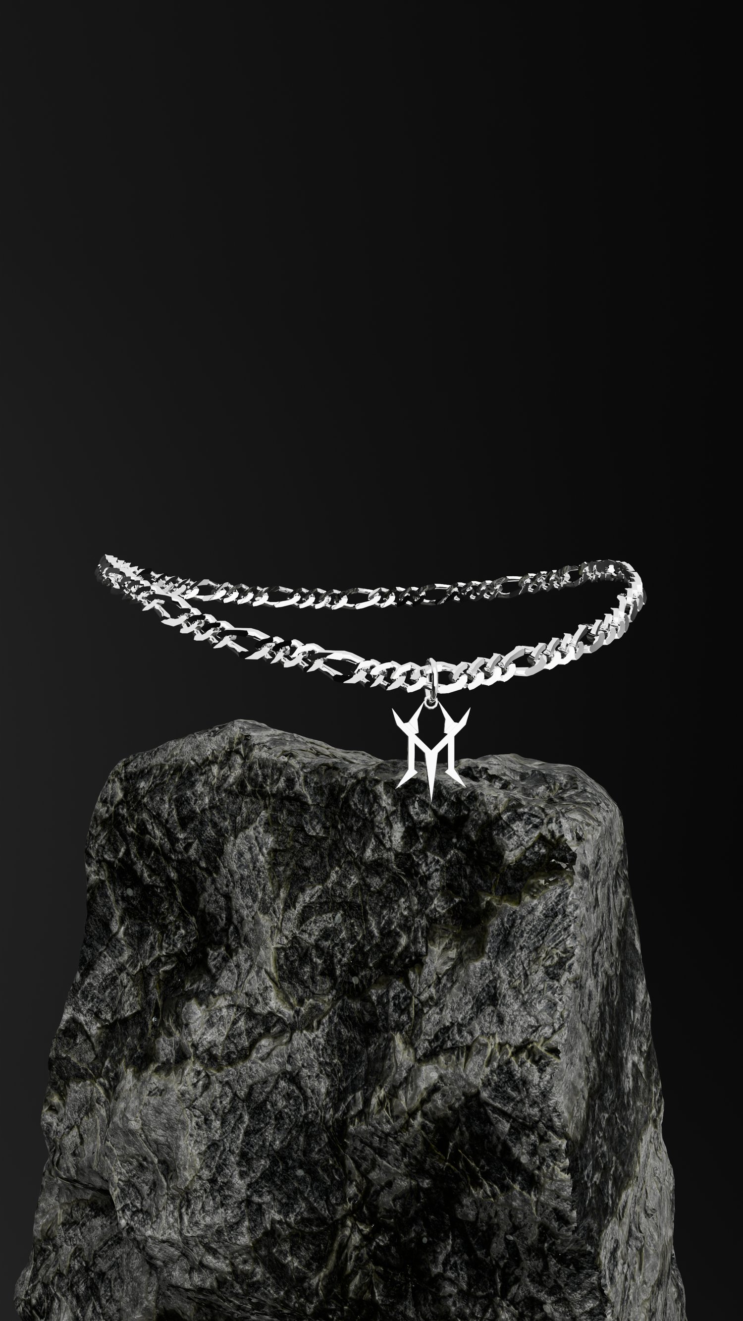 The Offering is a Figaro link chain hung with the HYSTERIA emblem, polished like devotion, weighted like guilt. A symbol of opposites held in tension: clarity born from madness, devotion edged with defiance, surrender masquerading as control. This isn’t decoration. It’s contradiction, forged in metal, and worn like truth.
