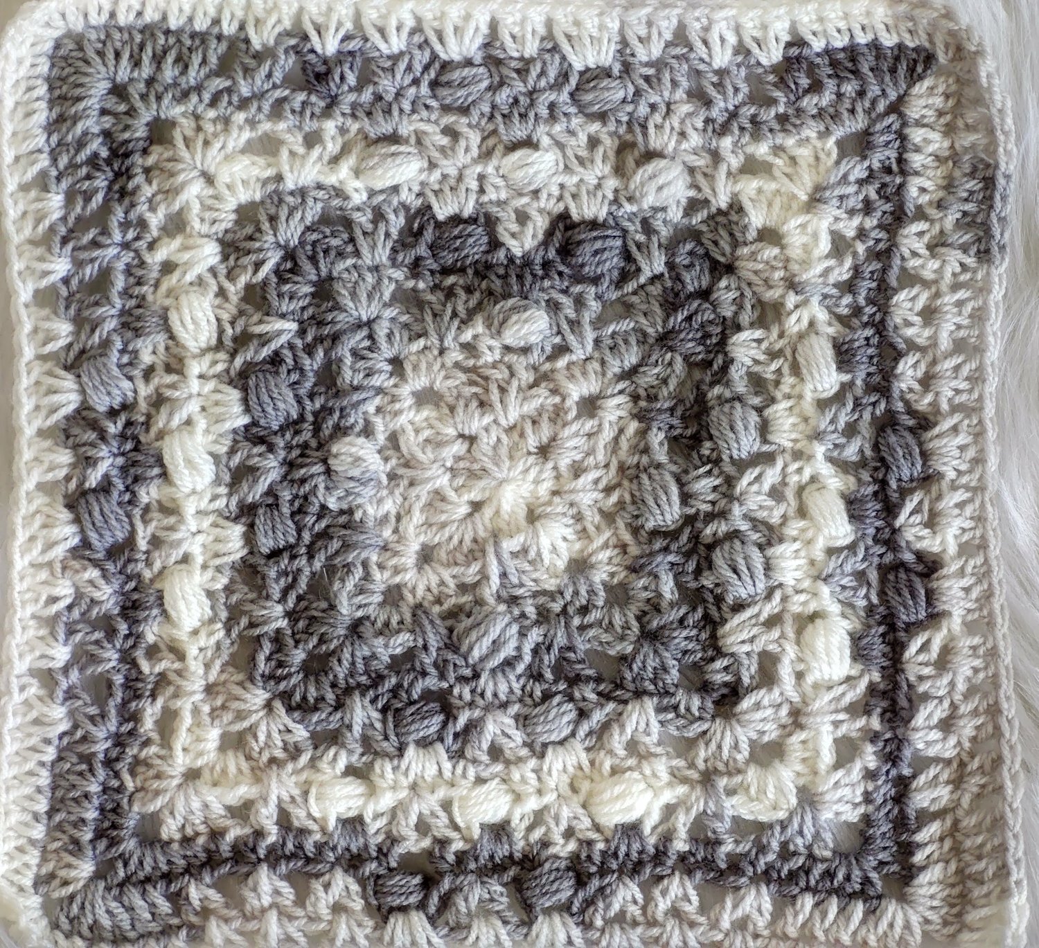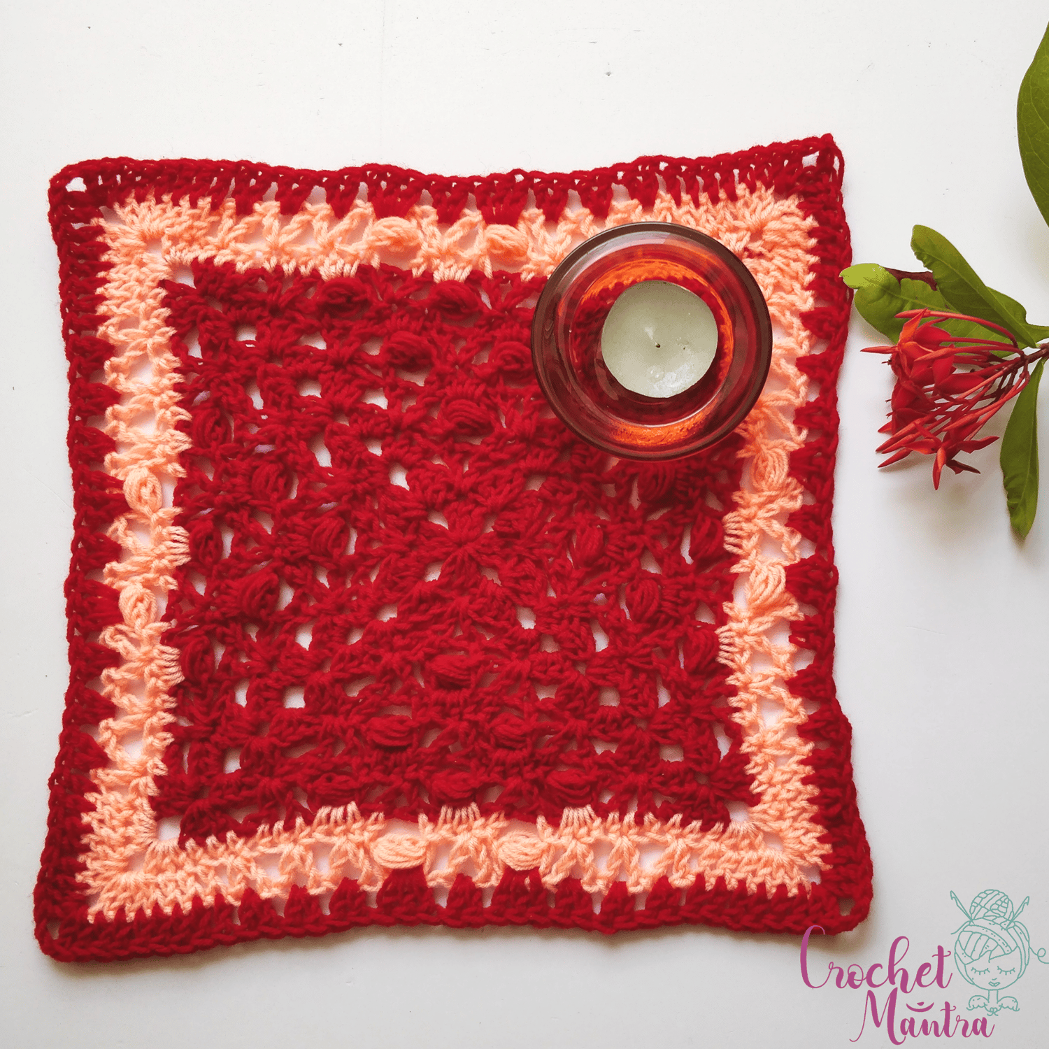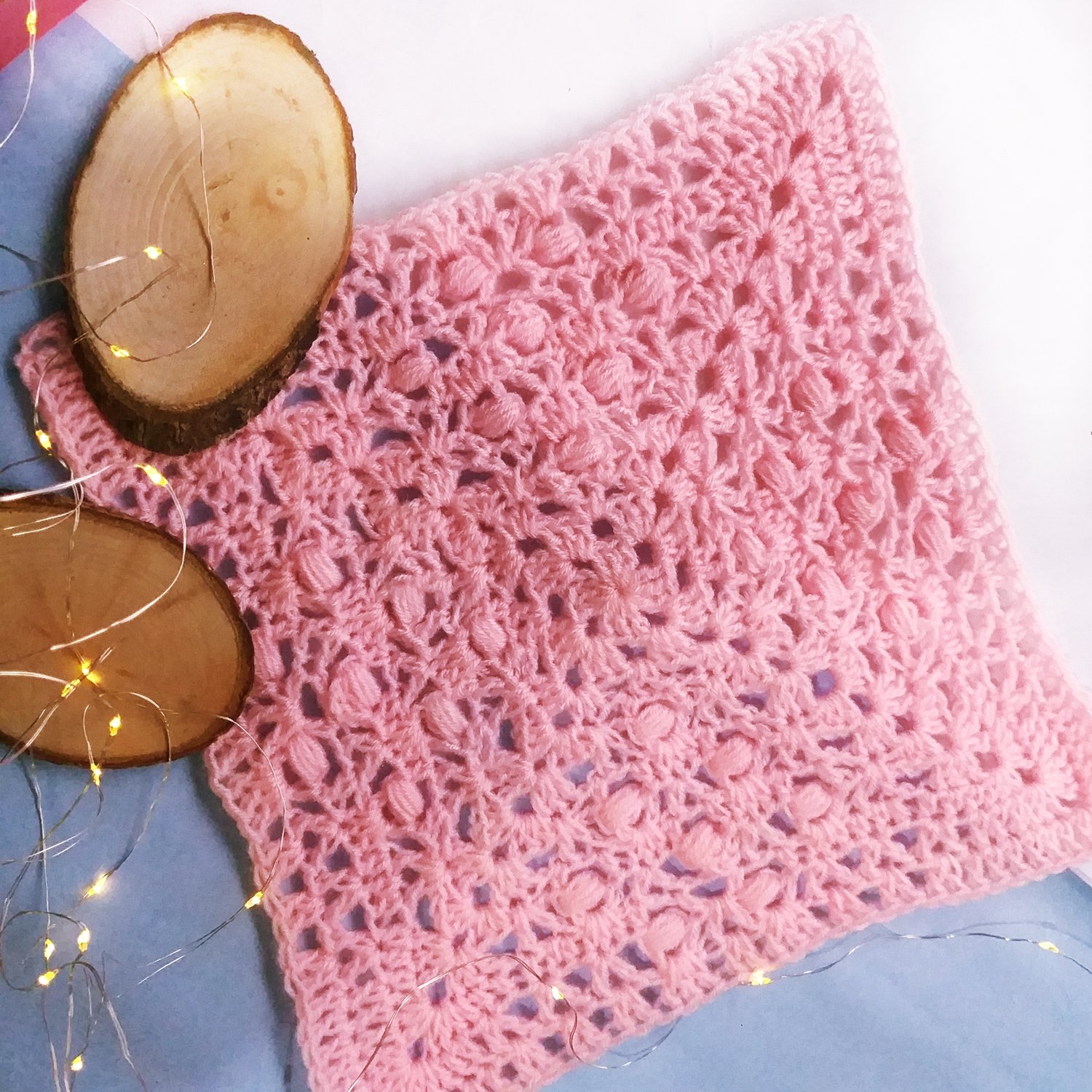 Megam means cloud and when we talk of rains and monsoon, the cloud is the key! Megam refers to just about any cloud while Kaarmegam stands for raincloud. We decided to go with Megam as they come together to form the Kaarmegam. To show the transition, the sample has been done with blue/white Lion Brand ice cream yarn and the grey/white Lion Brand ice cream yarn. This yarn is just so soft and oh so perfect for the clouds. The same puff stitch used in Thooral became the base for the cloud and is worked horizontally to achieve this look. This square does not increase the puff stitches endlessly till the last round but rather we have tried to depict an elliptical shape with the placement of stitches. Care must be taken to note that change. One of the testers came back saying that they used to hate puff stitch but are a convert after making these two squares. This square sits perfectly with mild blocking.