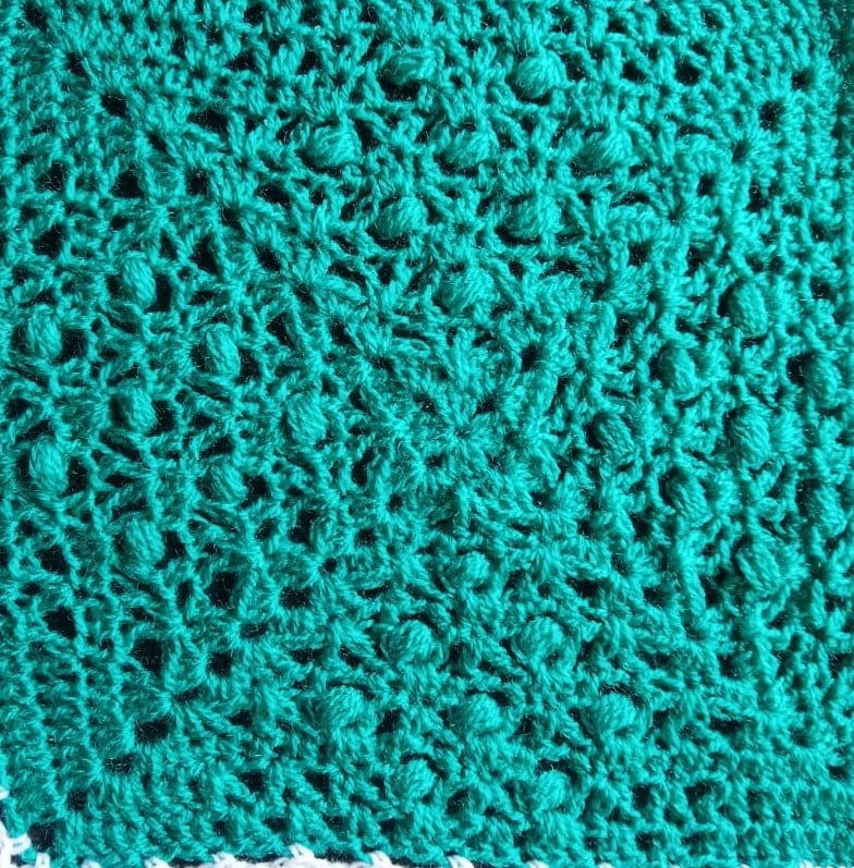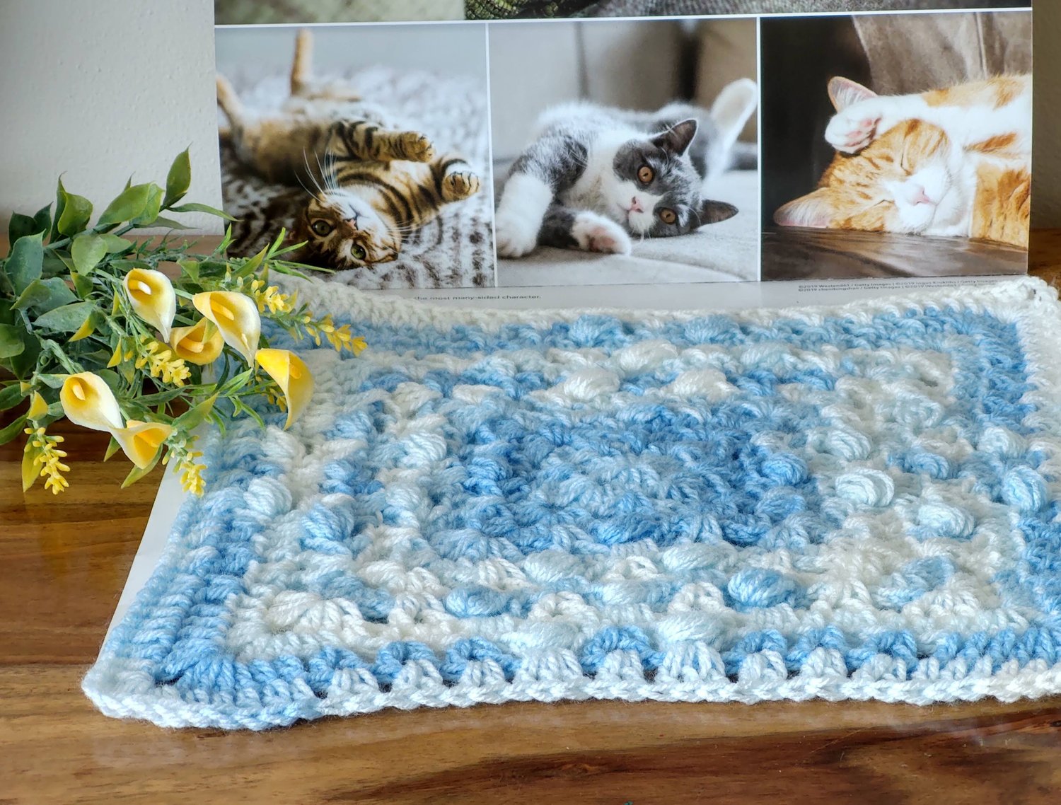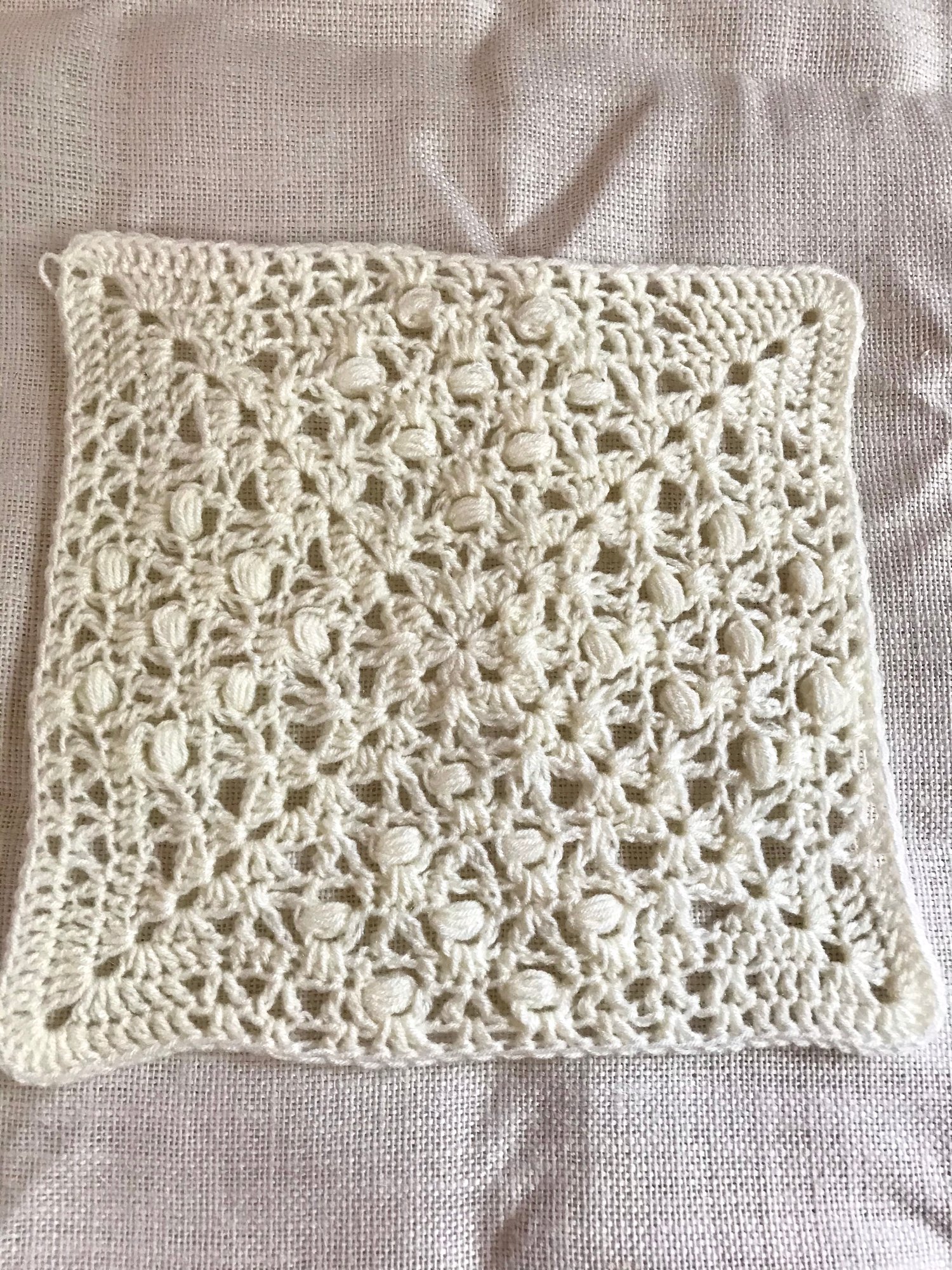 Megam means cloud and when we talk of rains and monsoon, the cloud is the key! Megam refers to just about any cloud while Kaarmegam stands for raincloud. We decided to go with Megam as they come together to form the Kaarmegam. To show the transition, the sample has been done with blue/white Lion Brand ice cream yarn and the grey/white Lion Brand ice cream yarn. This yarn is just so soft and oh so perfect for the clouds. The same puff stitch used in Thooral became the base for the cloud and is worked horizontally to achieve this look. This square does not increase the puff stitches endlessly till the last round but rather we have tried to depict an elliptical shape with the placement of stitches. Care must be taken to note that change. One of the testers came back saying that they used to hate puff stitch but are a convert after making these two squares. This square sits perfectly with mild blocking.