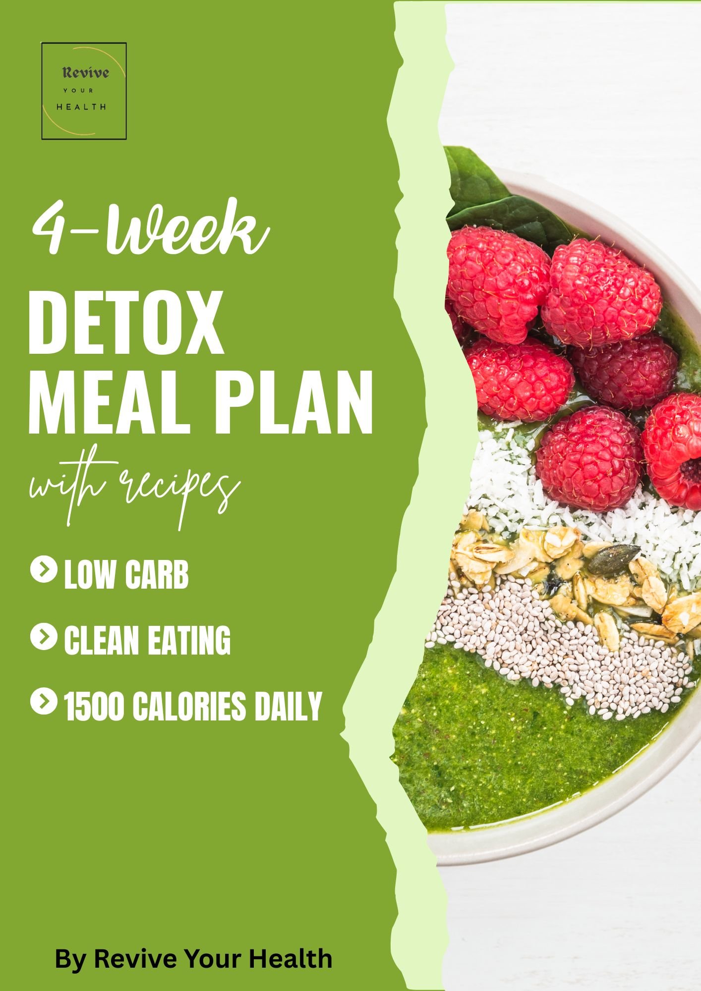 Kickstart your wellness journey with the 4-Week Detox Meal Plan with Recipes by Revive Your Health. This easy-to-follow guide offers a structured plan featuring low-carb, clean-eating meals designed to help you reset your body, boost energy, and support weight management—all while maintaining a 1500-calorie daily intake. Packed with delicious, nutrient-dense recipes, this meal plan makes healthy living simple and sustainable. Perfect for anyone looking to enhance their well-being with flavorful, wholesome meals.