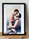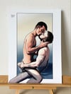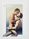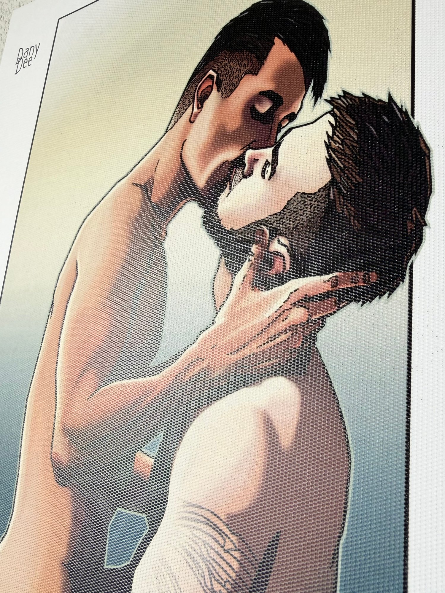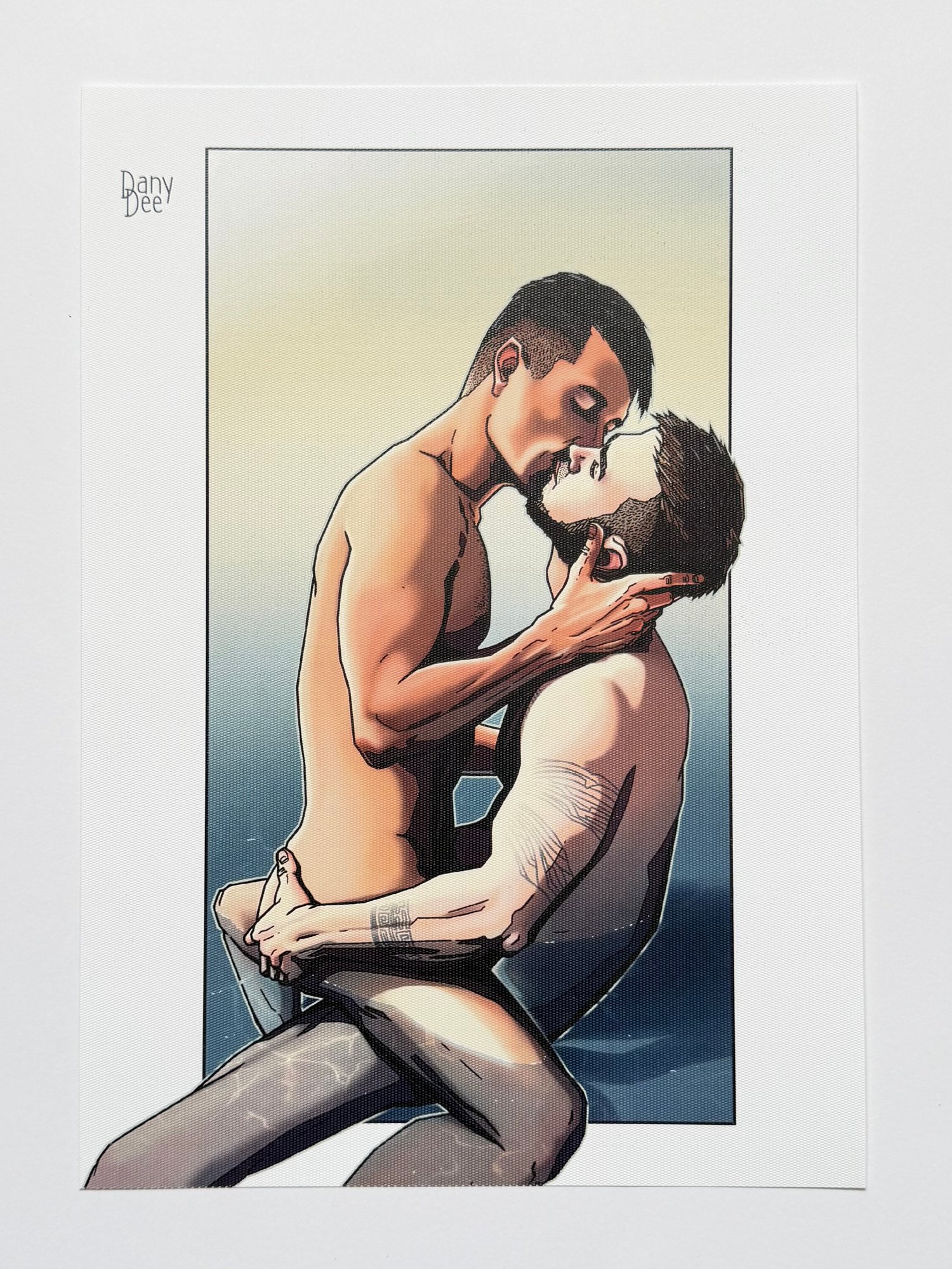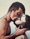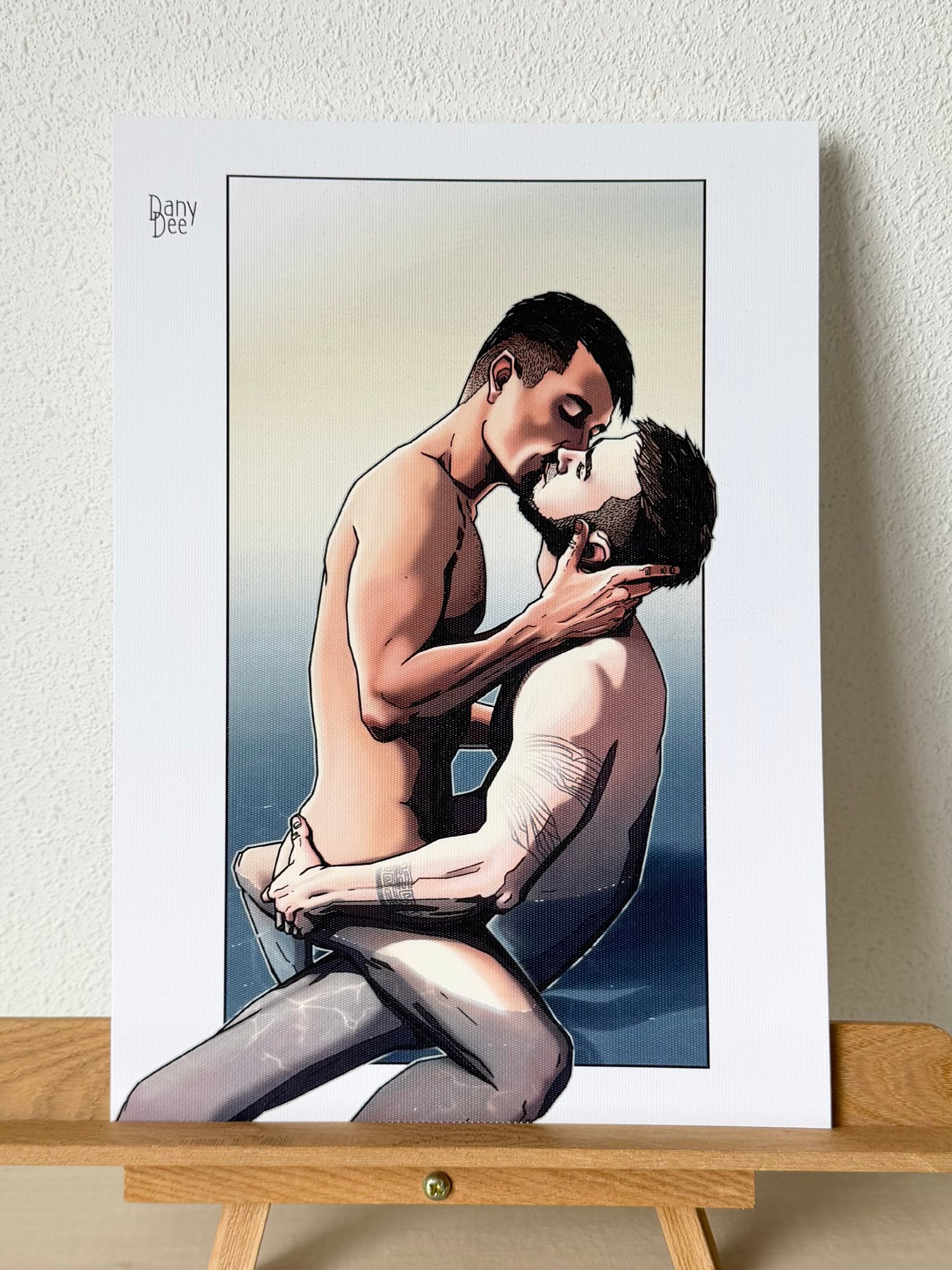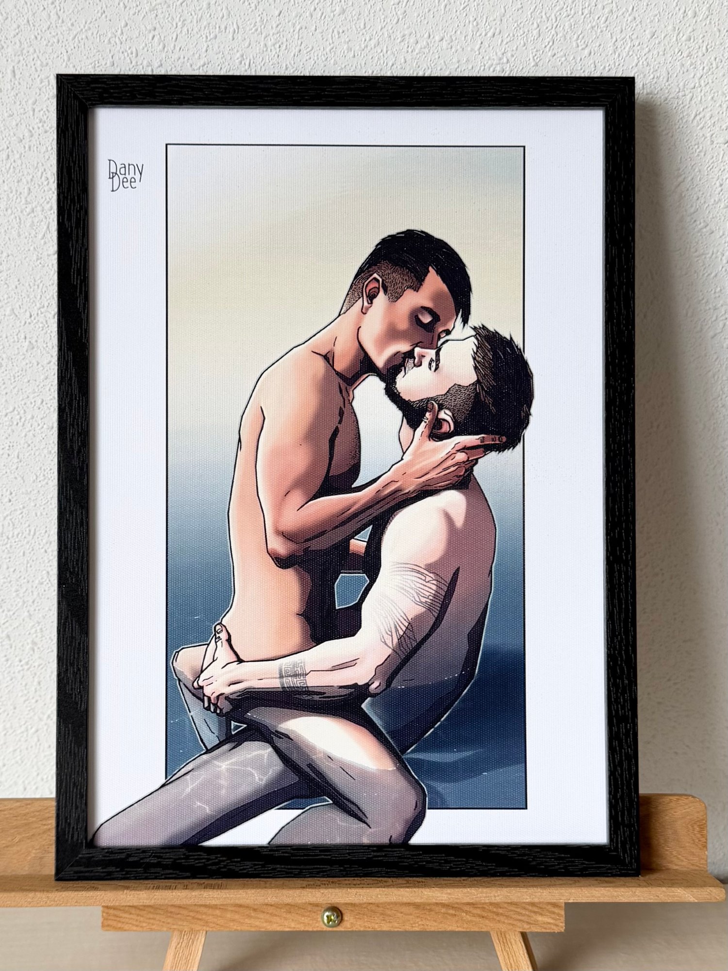 “The Kiss” is a hand-drawn, full-colour A4 art print celebrating gay romance — a tender, intimate illustration of two young men sharing a kiss in a sun-lit swimming pool, perfect for LGBTQ+ home decor or as a meaningful gift for a gay couple.