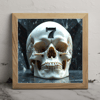 Number 7 skull obsidian marble deeply engraved character on the forehead of a white marble skull. The character, filled with dark obsidian, contrasts sharply against the pale skull. Set against a black crystalline background, the skull and character dominate the image.