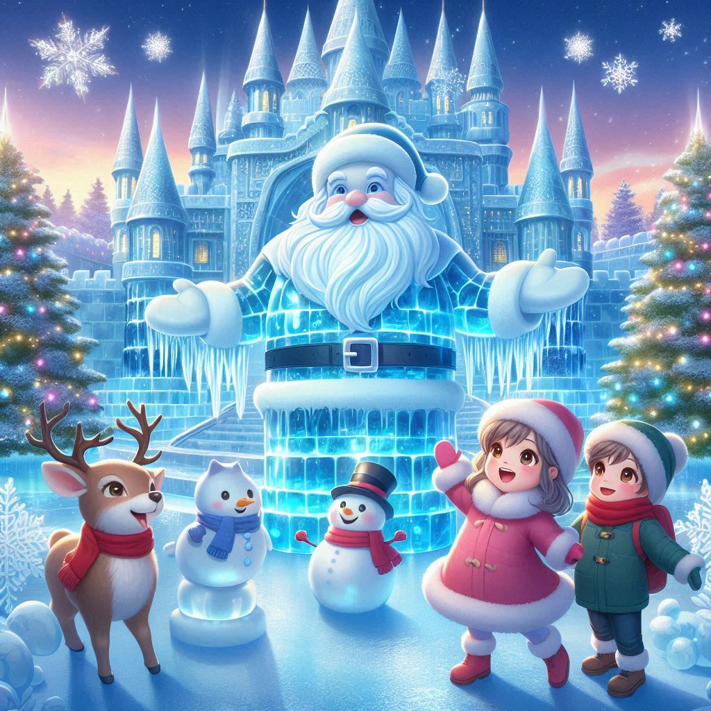 Upon entering the ice sculpture castle area, they were greeted by an endless expanse of ice sculptures, each radiating brilliant and dazzling colors and light. This beautiful scene stunned the three children, who spontaneously jumped up. In particular, the lifelike ice sculpture of Santa Claus, several meters high and closest to the castle gate, along with the snowman, deer, and Christmas tree at his feet, was exquisitely beautiful and radiant—a truly breathtaking sight!