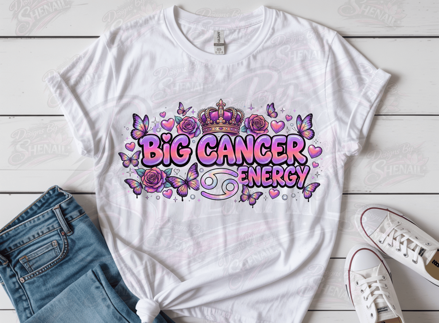 Step into your soft power with this stunning “Big Cancer Energy” design. Featuring a glowing pink and purple gradient, delicate butterflies, roses, hearts, and a royal crown, this design is the perfect blend of feminine energy and zodiac pride.