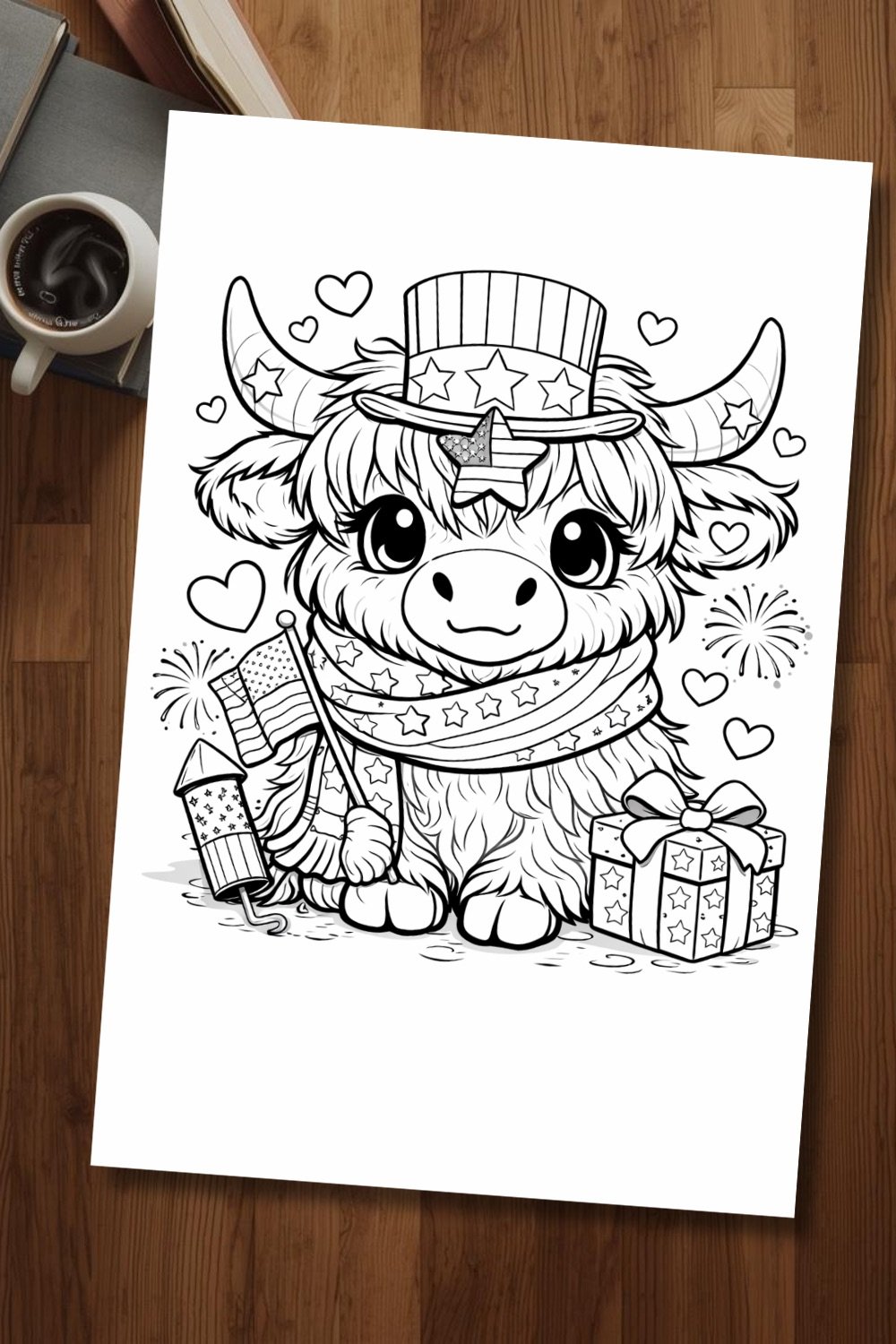 This adorable cartoon cow is all dressed up for the holiday, surrounded by stars, fireworks, and cheerful flags—ready for you (or your kids!) to color and bring to life. Perfect for a cozy, creative, and festive activity this July 4th.