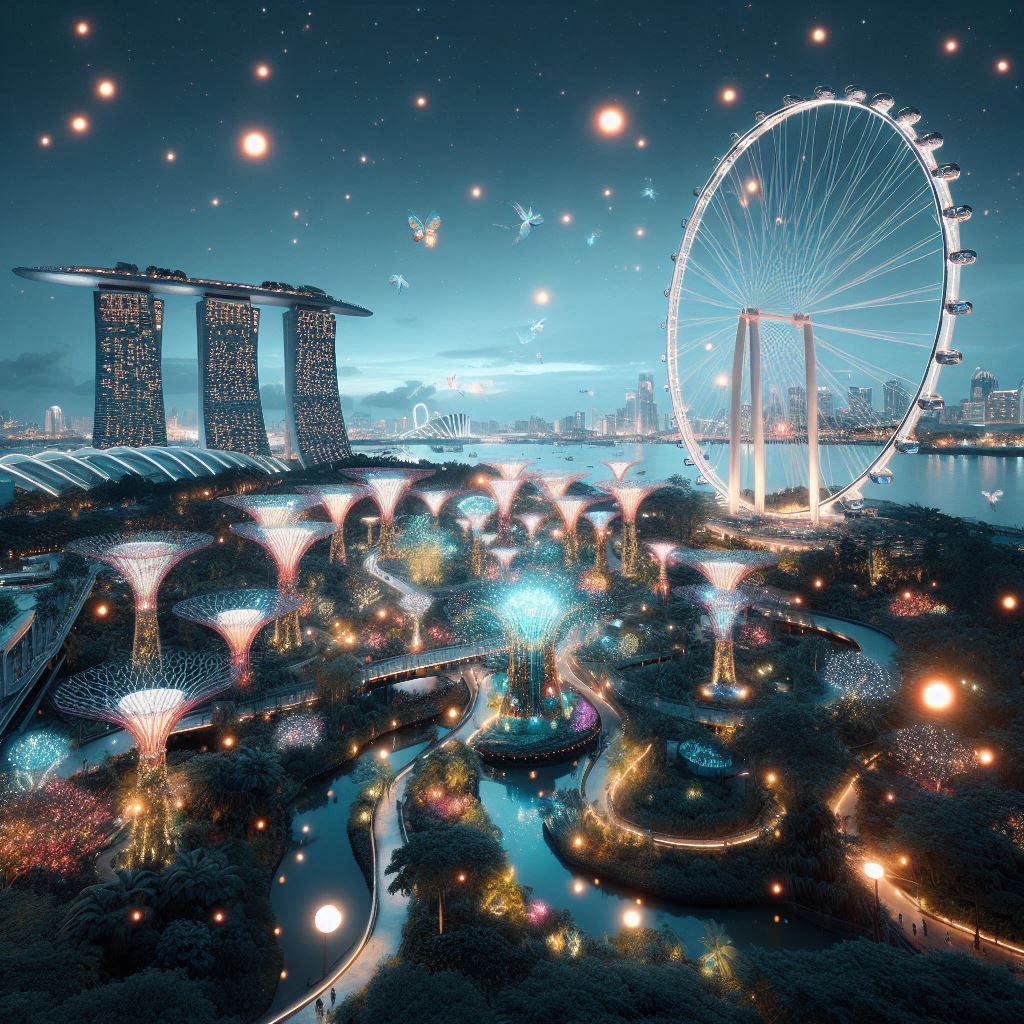 獅城島國濱海花園的夜景!如詩如畫!當你在黃昏或夜晚漫遊踏入這一片濱海花園你和你身邊的人會被這一個充滿浪漫色彩的夜景所吸引住!夜晚的繁星被燈光點亮奇異頂天大花树高雅設計的酒店和不遠處亮麗的摩天觀景輪,同時一陣陣的花香瀰漫在空氣中自己彷彿置身在世外桃源!當你在欣賞這一副美麗的風景畫面时,你不得不讚嘆這一群在幕後策劃和付出嘔心瀝血的幕後功臣!從填海造地設計到完成!這樣一副美好歷史見證的優美景觀需要耗時二三十年的時間不斷持續优的去完成這項大工程!是非常值得國人和旅客去穿戴和收藏成紀念品!