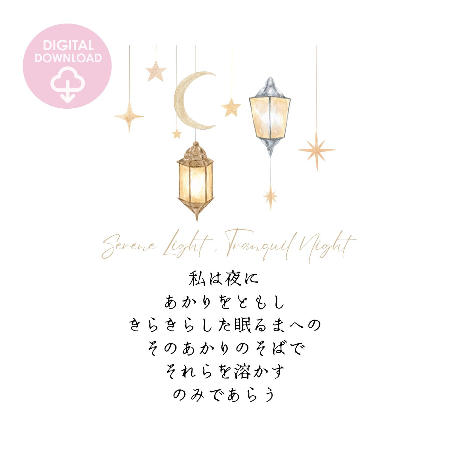 Bring a sense of tranquility to your child's room with this enchanting celestial wall art. Featuring a stunning watercolor painting of an Islamic lantern and a starry night, this artwork is enriched with an inspirational quote from a classic poem by Tachihara Michizo. The poem, celebrated for its delicate and ethereal style, describes the gentle twinkling of a lantern light before sleep, written in beautiful Japanese. This high-quality printable art is perfect for adding a touch of serene beauty to any nursery or girl's bedroom.
