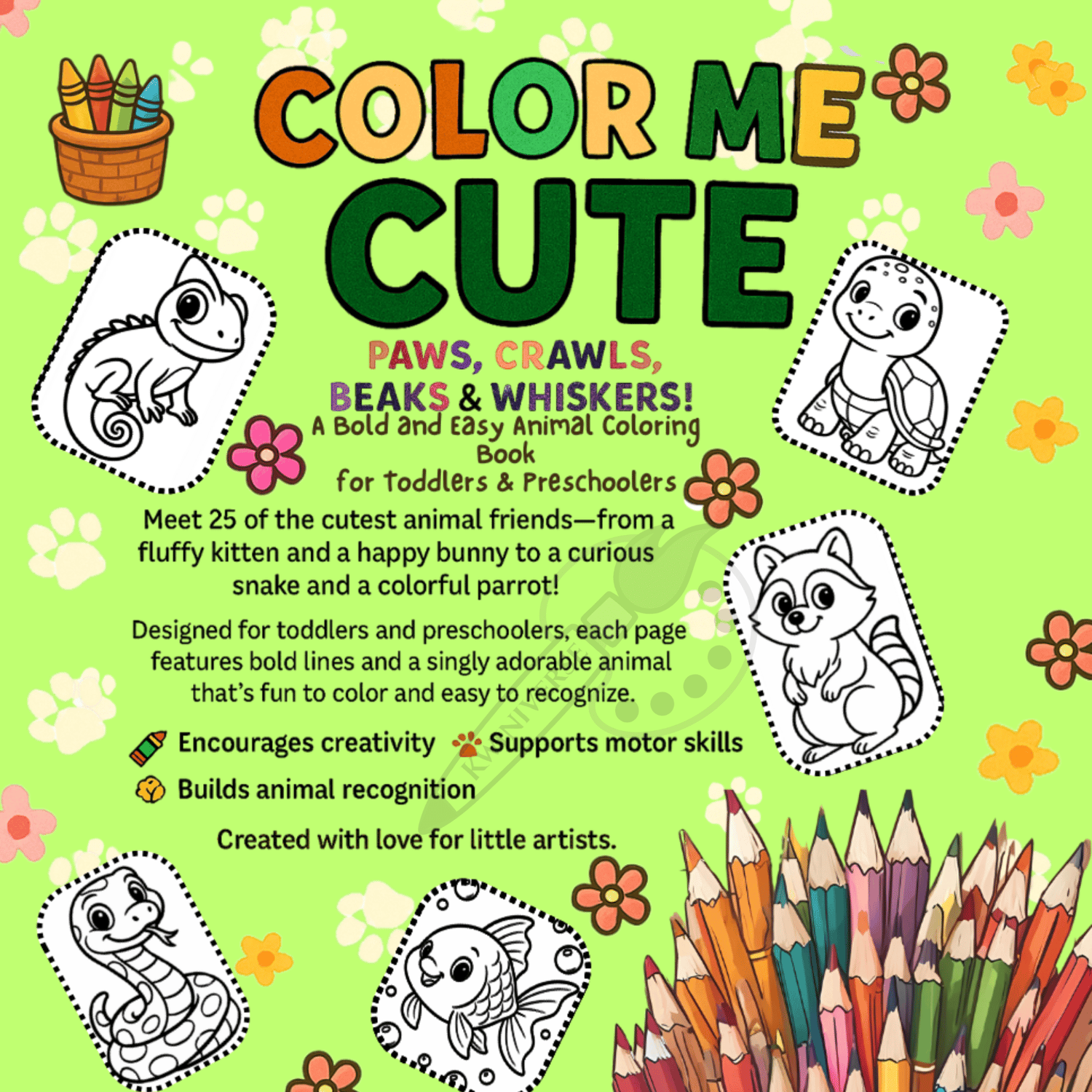 Introduce your little one to 25 adorable pet and animal friends in this printable coloring book for toddlers and preschoolers. With bold lines and charming designs, each page encourages creativity, focus, and joyful learning.