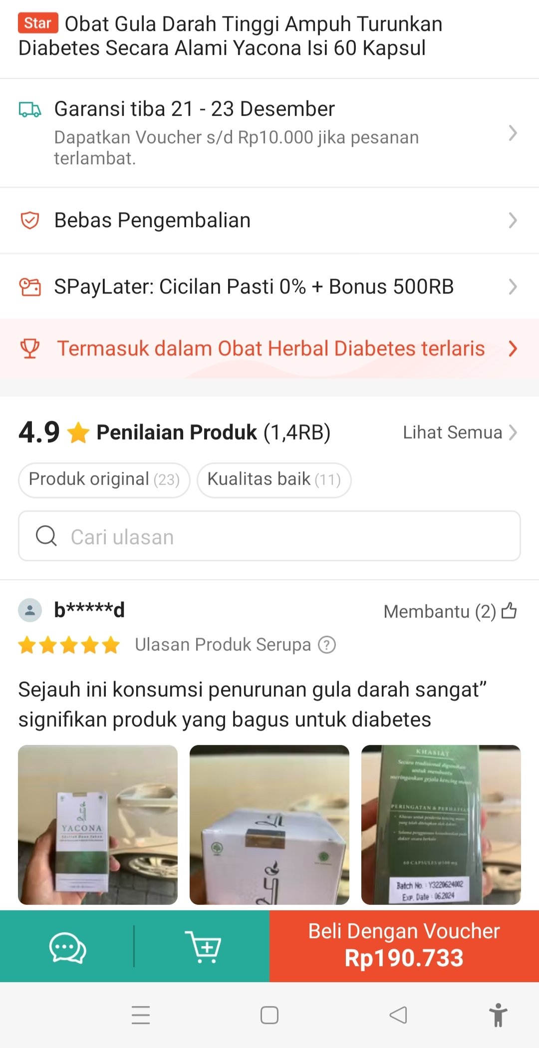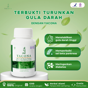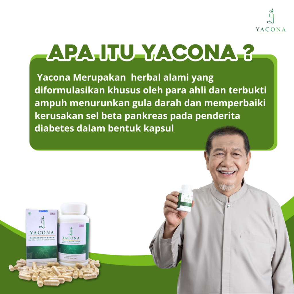 Yacona is a herbal product combining yakon leaf extract, sambiloto, and bay leaf extract, packaged in capsule form and effective in helping lower blood sugar levels in people with type 2 diabetes and pre-diabetes.