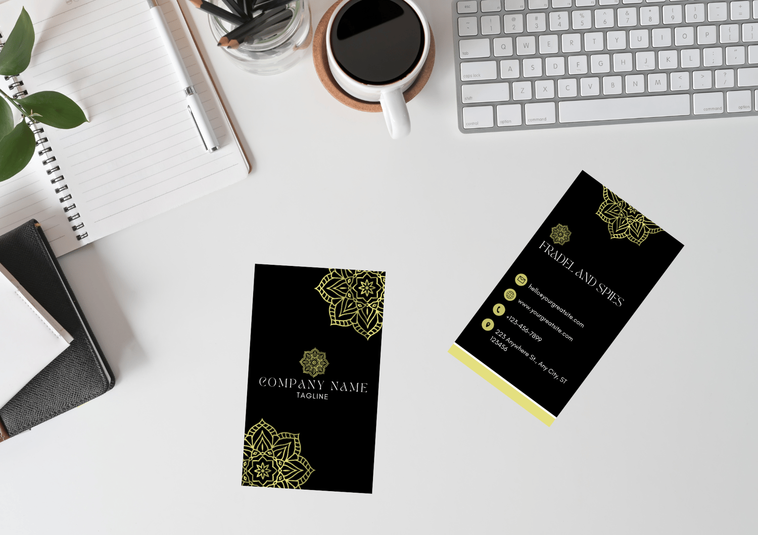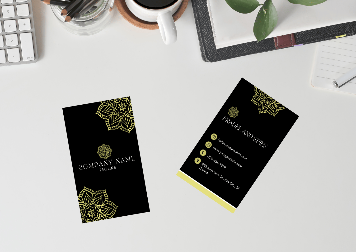 Gilded Elegance Black and Gold Mandala Logo Vertical Business Card