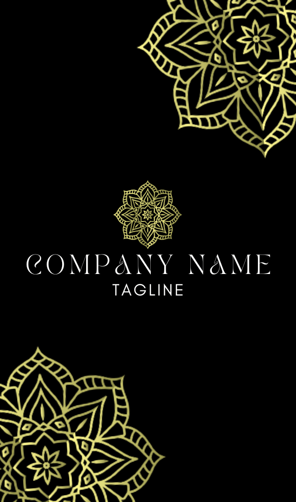 Elegant Mandala Logo Design: The centerpiece of this business card is a stunning mandala meticulously designed to exude a sense of harmony, balance, and beauty. The elaborate black and gold design gives