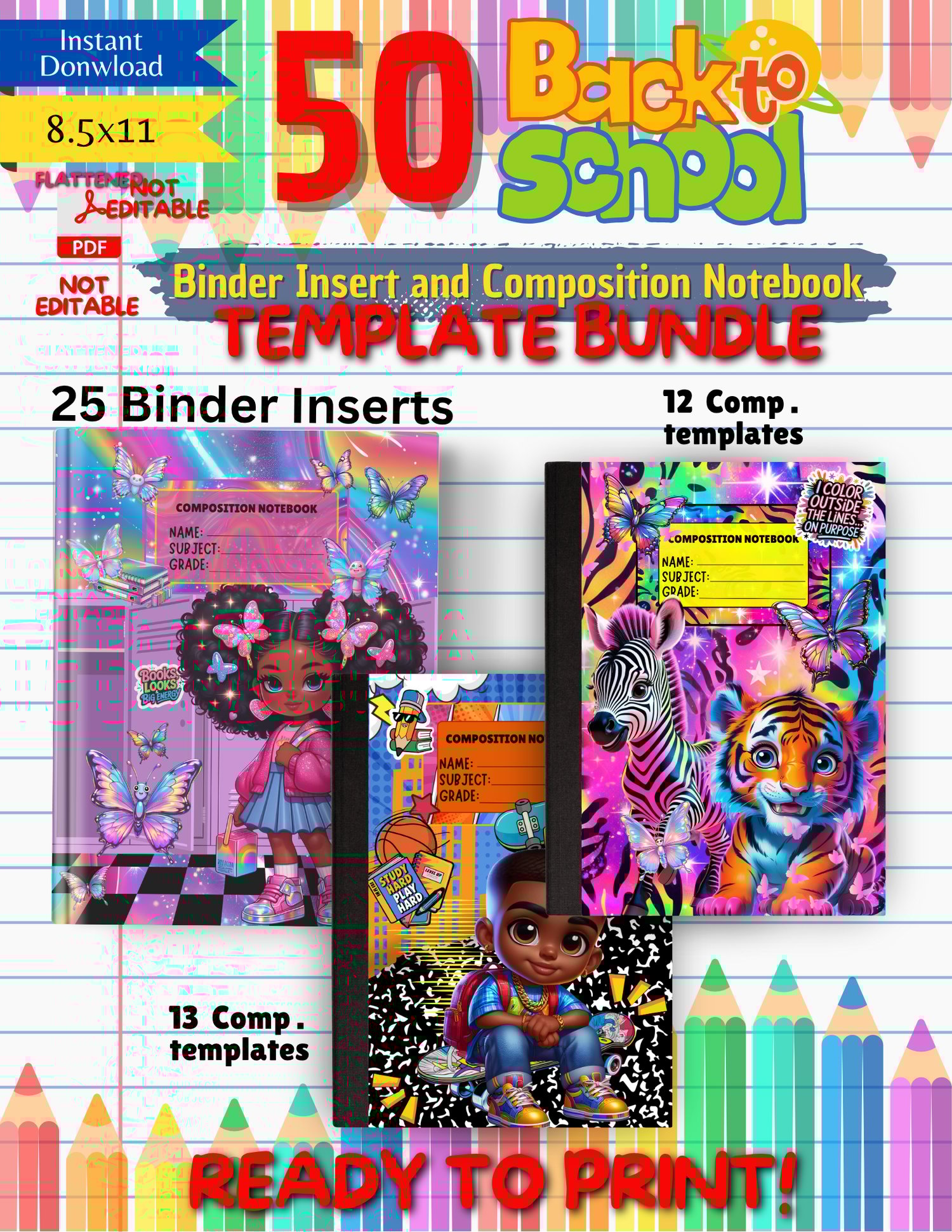 Upgrade school supplies with style and confidence! This vibrant, ready-to-print Back to School Template Bundleincludes 50 pages of bold, trendy, and kid-approved notebook and binder covers â perfect for classroom prep, shop listings, or thoughtful custom gifts.