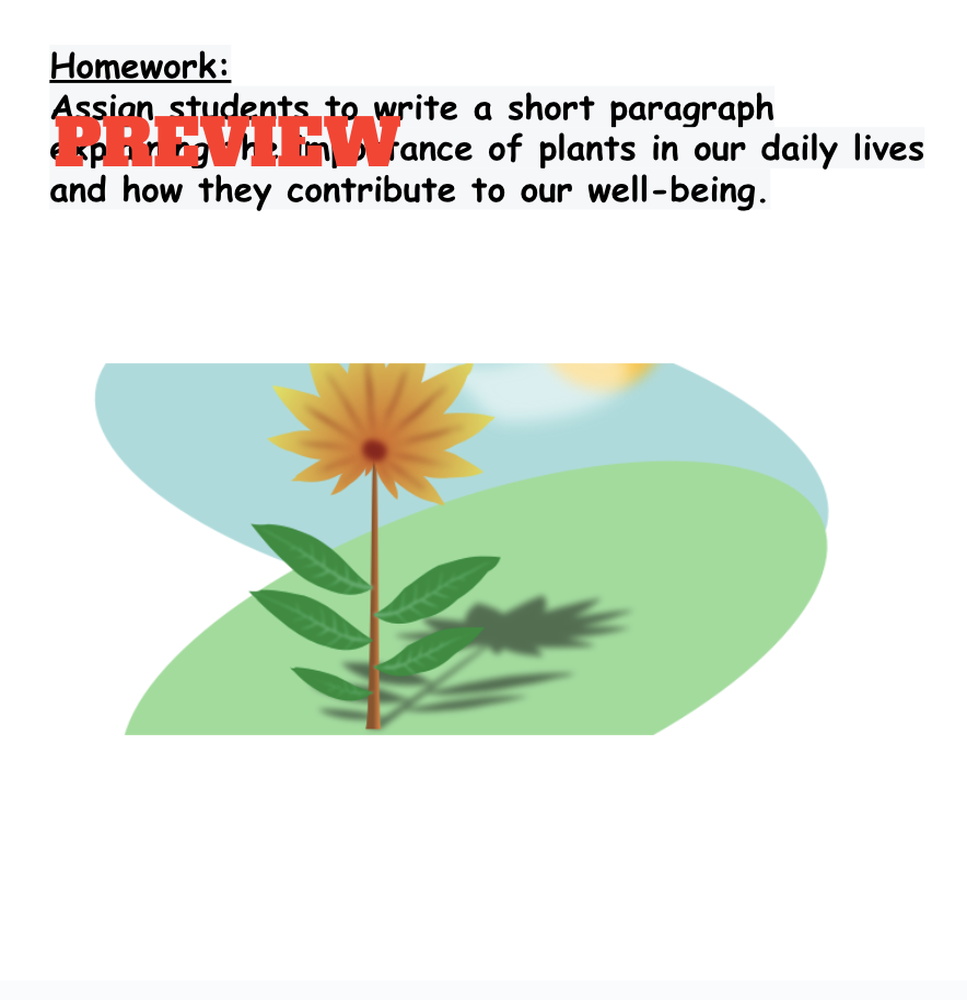 Plants consist of various parts that work together to facilitate their essential functions, with key components including roots, stems, leaves, flowers, and fruits. Roots anchor the plant in the soil and absorb water and nutrients, while stems provide structural support and transport water, nutrients, and sugars throughout the plant. Leaves are the primary sites for photosynthesis, containing chlorophyll which captures sunlight energy to convert carbon dioxide and water into glucose and oxygen. Flowers are reproductive structures that produce seeds and fruits, facilitating the plant's reproductive cycle. Photosynthesis, a vital process for plants, occurs predominantly in the chloroplasts of leaf cells, where chlorophyll absorbs light energy to drive the conversion of carbon dioxide and water into glucose and oxygen, supplying the plant with energy and releasing oxygen into the atmosphere.