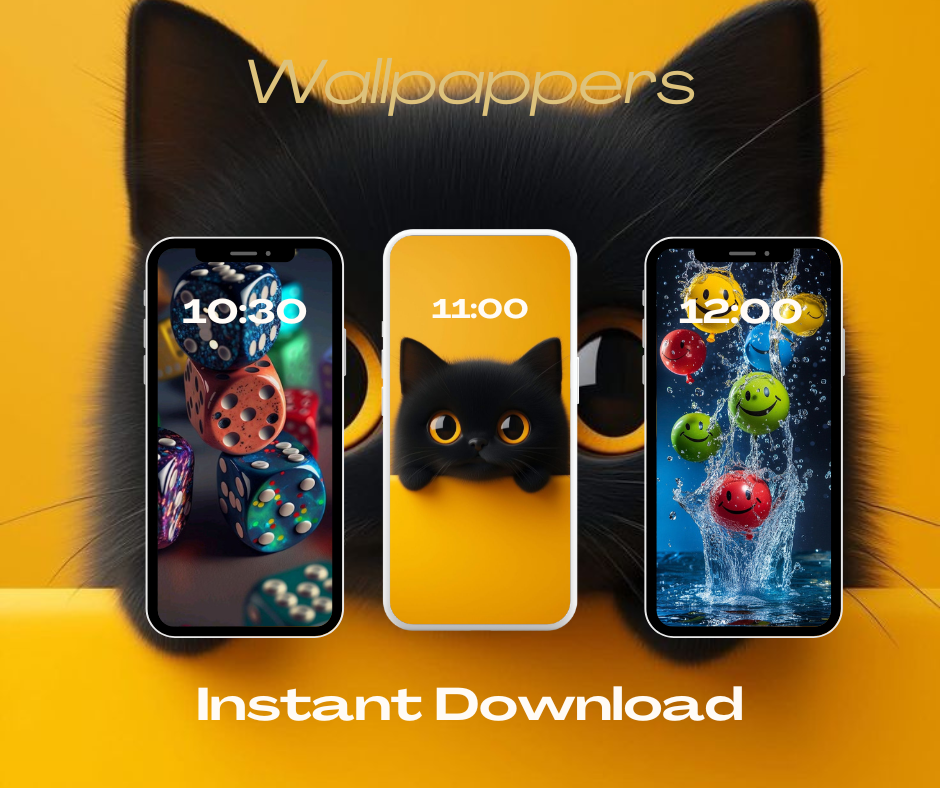 Give your phone a unique and vibrant look with this stunning wallpaper collection! Featuring a mysterious black cat on a striking yellow background, colorful dice, and playful floating smiley balls, this set is perfect for those who love bold, fun, and eye-catching designs.