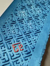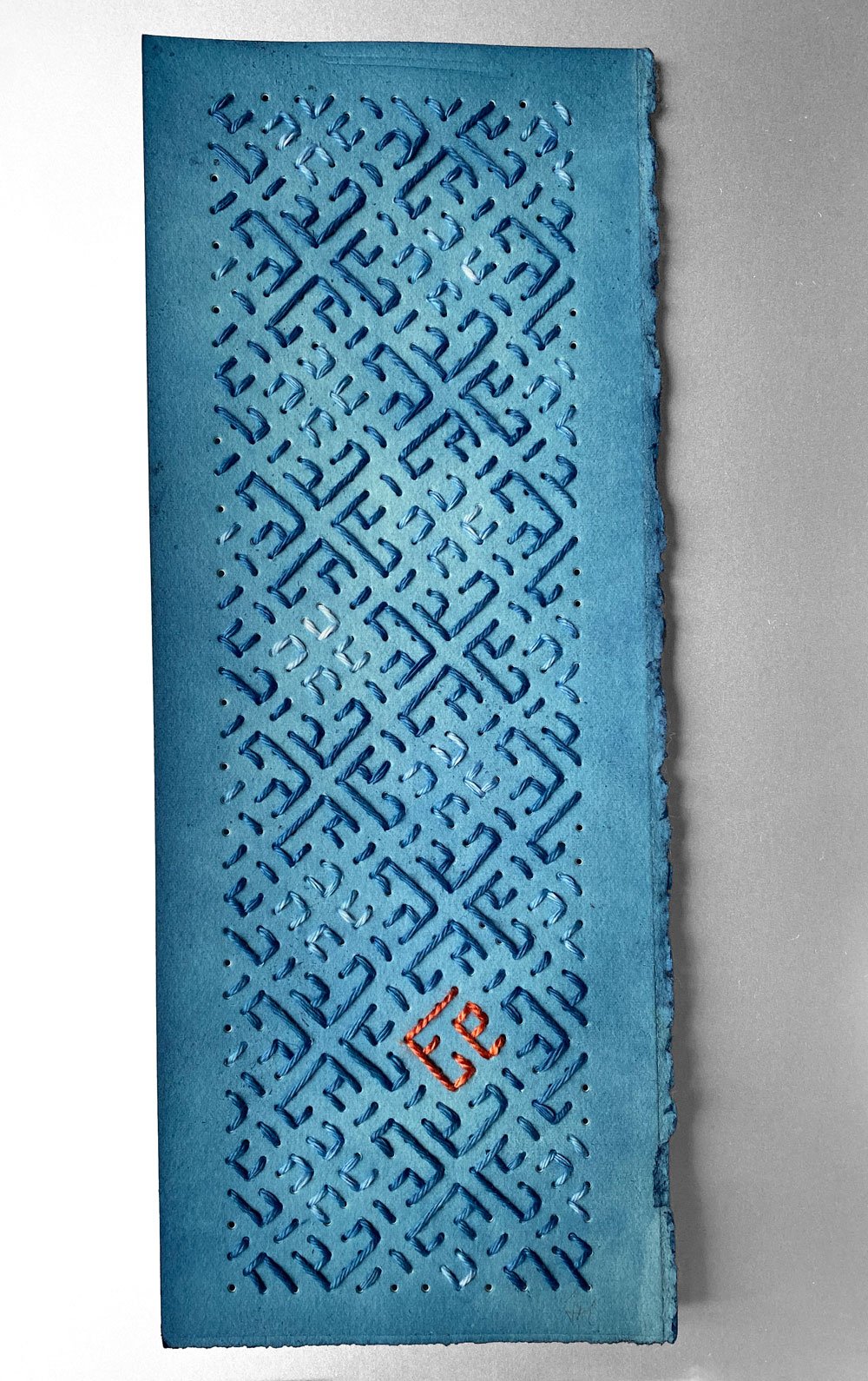 In the Third Veil, stitched with cotton over light indigo paper, madder-dyed silk introduces the word حياة (Life) in the pattern: it takes up exactly the same square as حداد (Mourning).