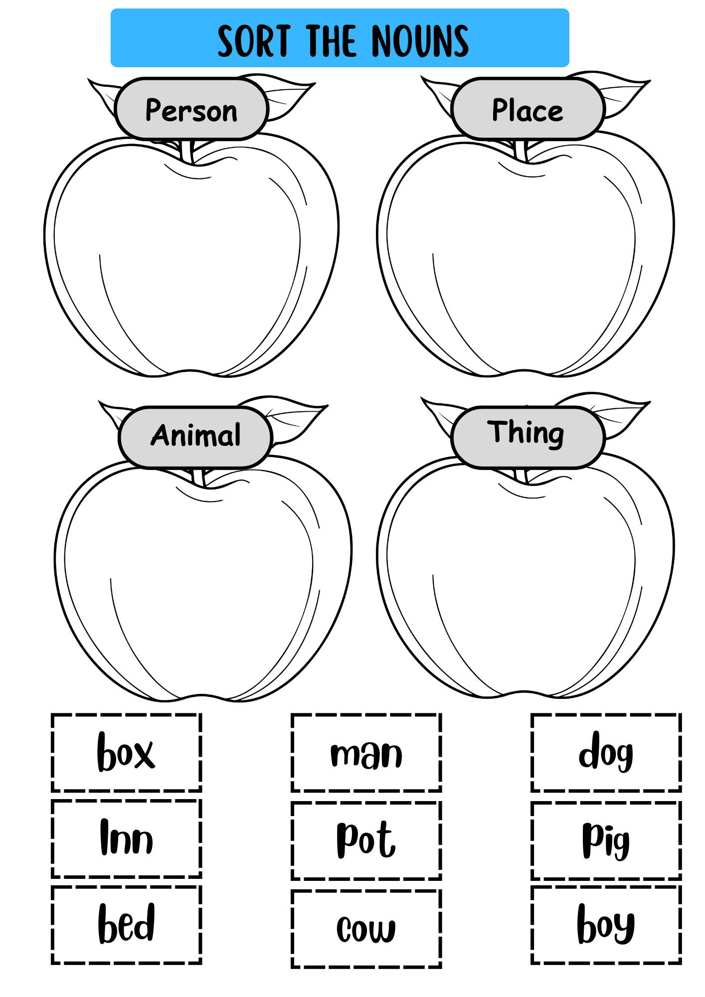 A noun is a person, animal, place, or thing. By breaking the concept down into these four steps, children can begin to identify the building blocks of language.