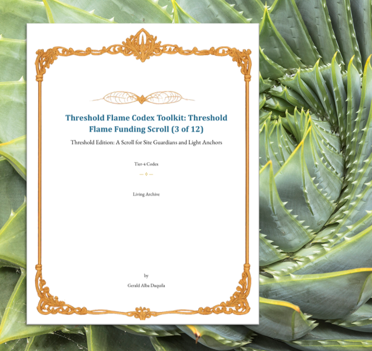 The Threshold Flame Codex Toolkit — Part 3 of 12 is a Tier-4 resonance-based proposal template for light stewardship, guiding the ethical resourcing of projects aligned with planetary healing and soul-led missions. It replaces conventional budgeting with principles of resonance, service, and sacred exchange, supporting transparent, light-based economies rooted in coherence and responsibility.