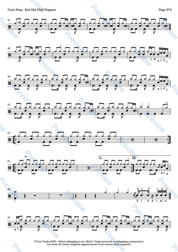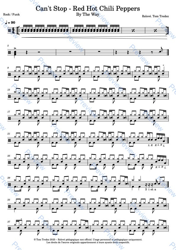 Partition complète de Can't Stop - Red Hot Chili Peppers, réarrangée pour la batterie, reprenant à l'identique la version de l'album.