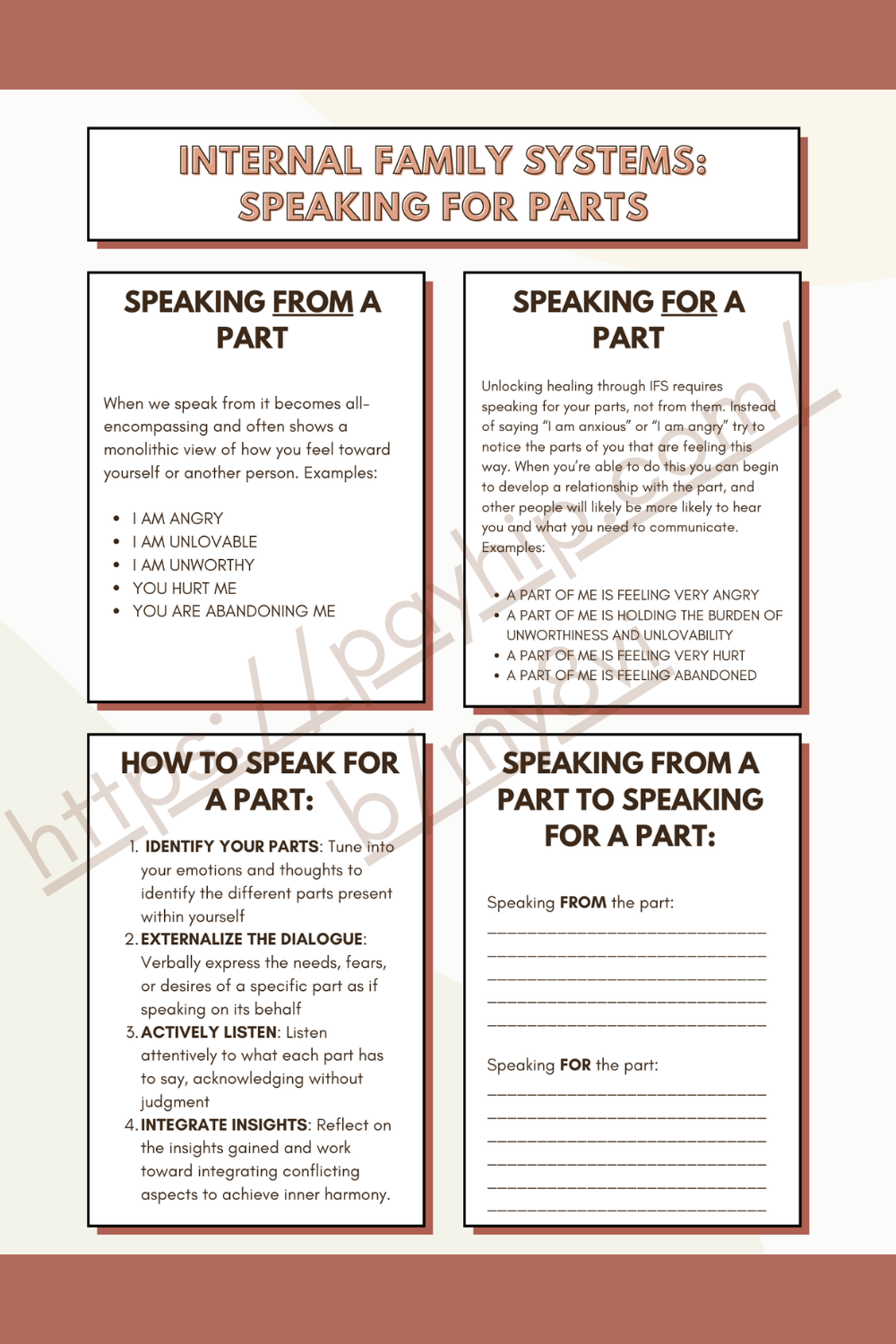 Internal Family Systems approach for helping you to speak for a part, rather than from a part. Helps with unblending a part from Self, and allowing Self to speak on the part's behalf.