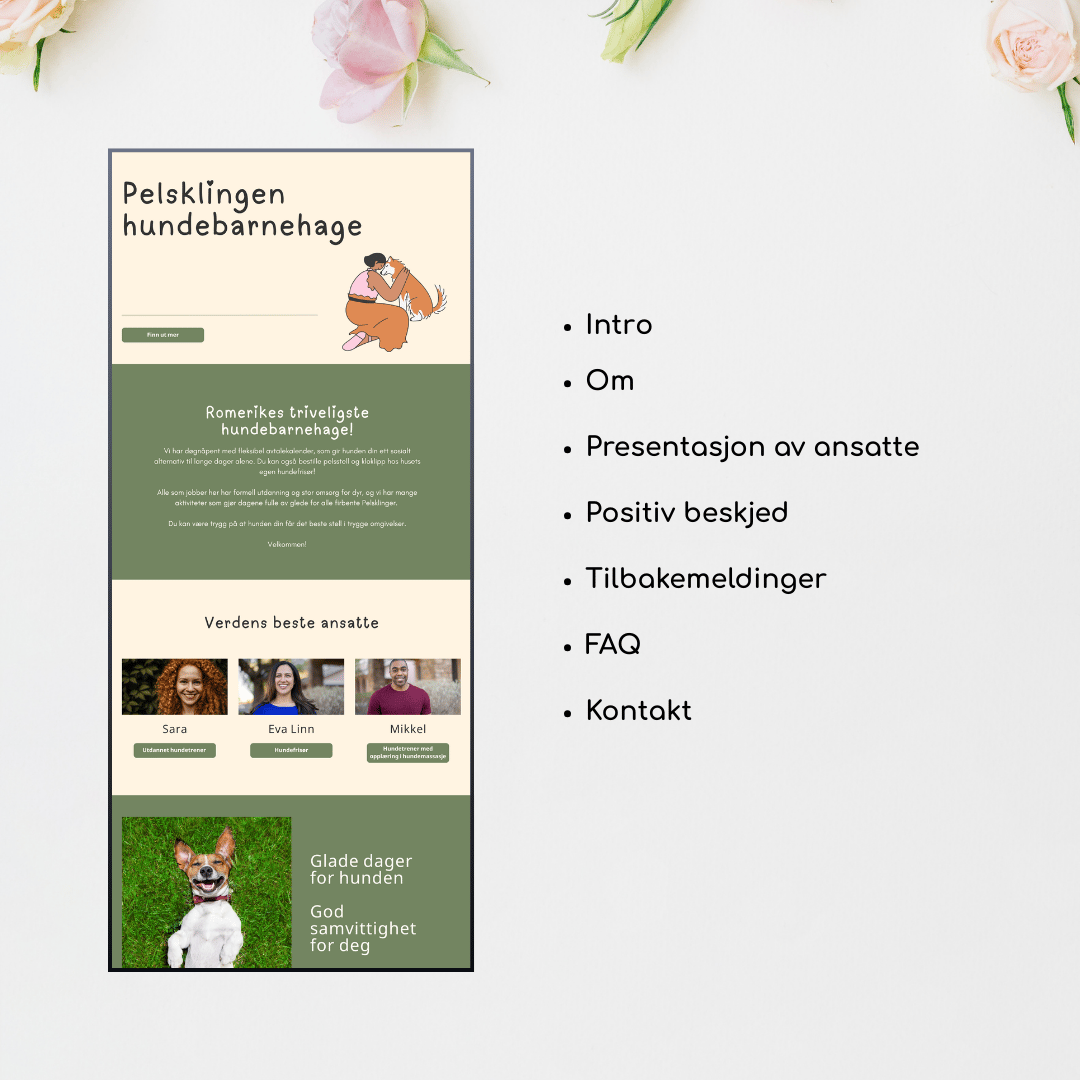 Sjarmerende Canva landingsside mal i Canva perfekt for dyrepass tjenester - tilpasset og laget med naturlige farger og myke fonter. Tilpass ditt behov med å endre tekst, farger, fonter og elementer etter egen smak. Perfekt for dyrepass, dressurkurs, hundefrisør, hundebarnehage og lignende.