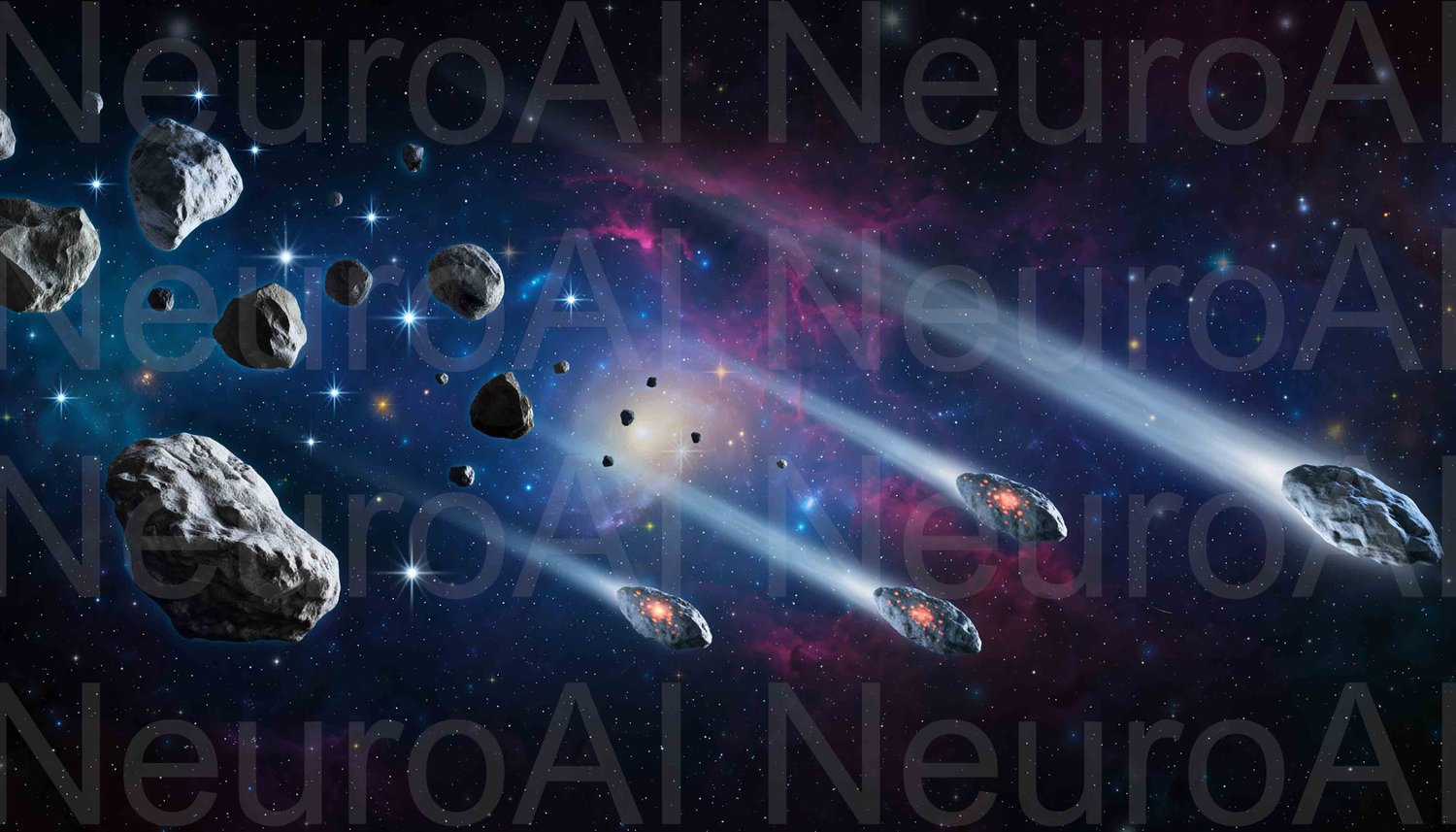 Dramatic asteroid field hurtling through colorful nebula