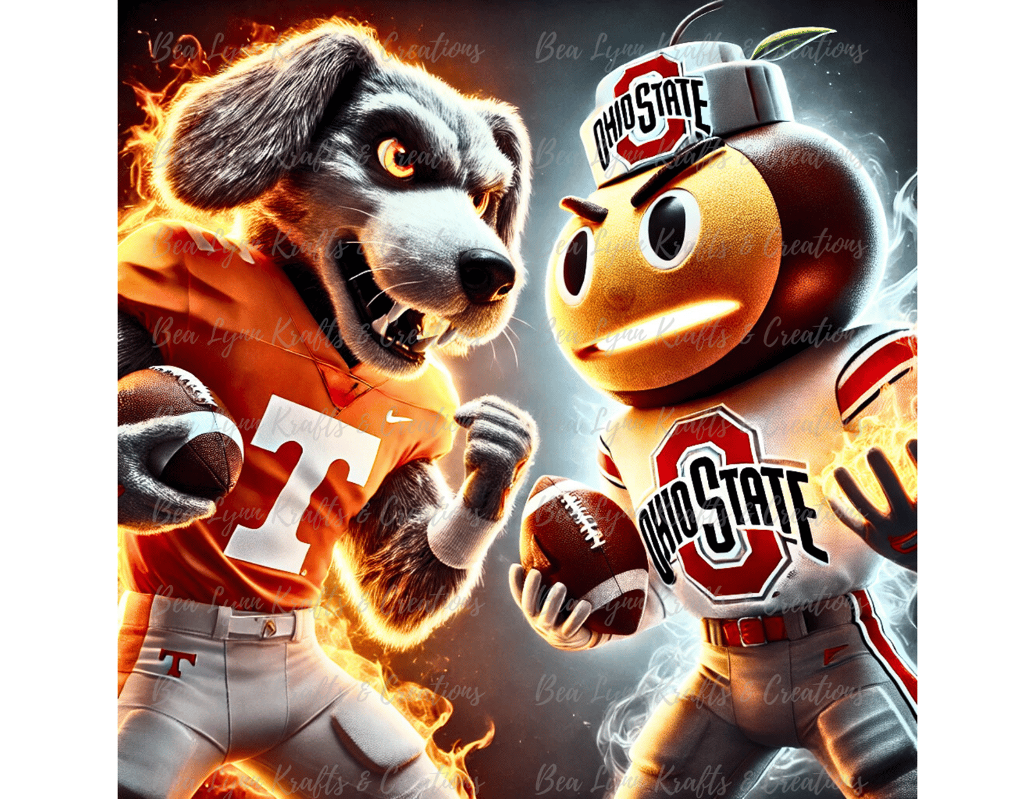 This high-energy transparent PNG captures the electrifying face-off between the Tennessee Volunteers and Ohio State Buckeyes mascots! With intense expressions, blazing footballs in hand, and a fiery glow highlighting their rivalry, this design embodies everything we LOVE about game day—passion, competition, and team pride. 🏈🔥 Whether you're a die-hard fan of Tennessee's Volunteer or Ohio State's Buckeye, this image is a must-have for true sports enthusiasts!