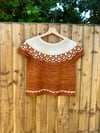 Knit from the top down in the round. Cropped style but can be knit to any preferred length. Designed to be worn with minimal positive ease, choose a size approx 0-2” / 0-5cm larger than your actual chest measurement.