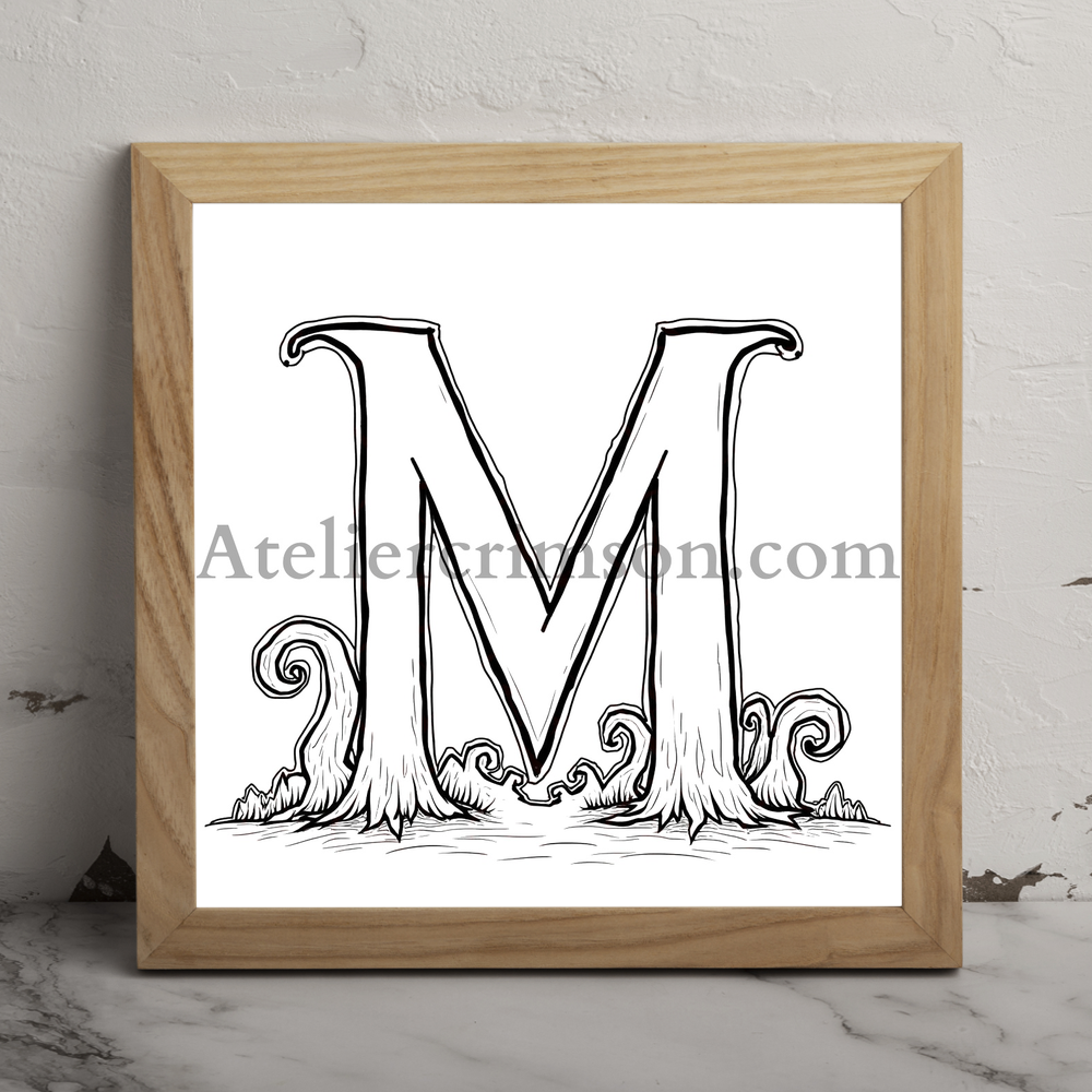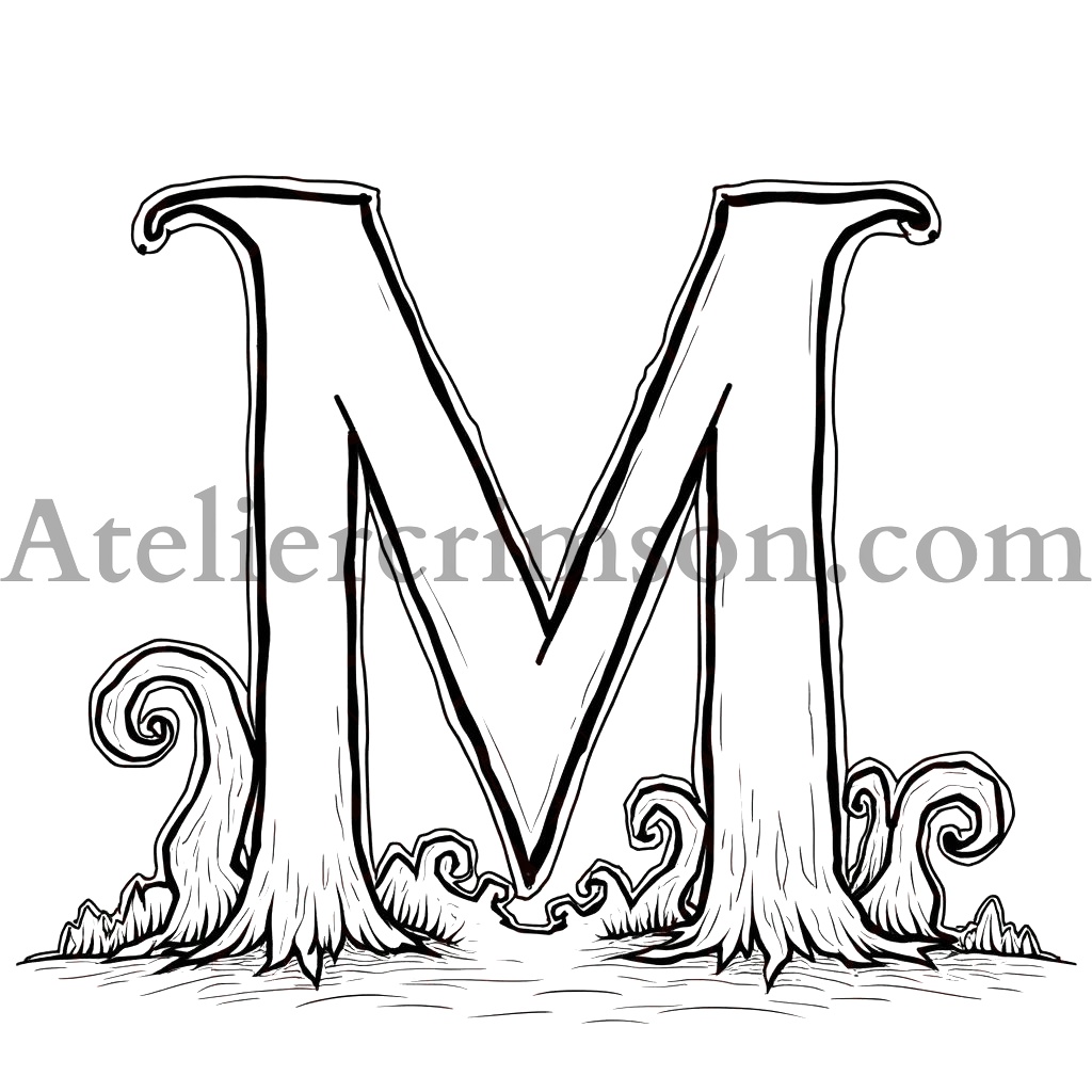 The letter M colloring book jack halloween Tim Burton-inspired alphabet art. Spooky-cute character in coloring book style. Perfect for Halloween crafts or gothic decor.