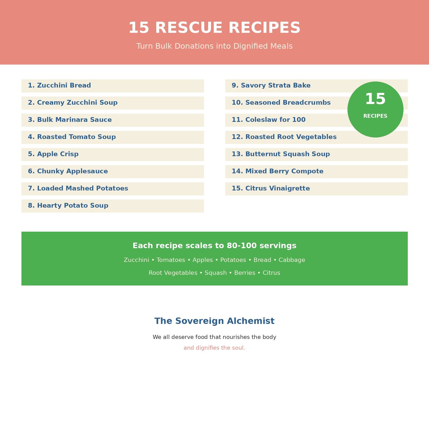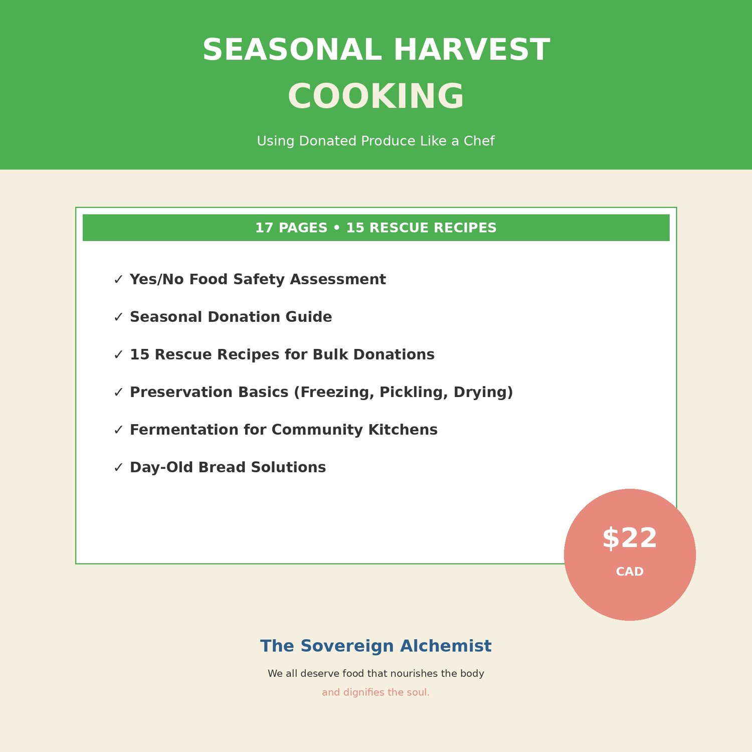 When you run a community kitchen, you don't plan your menu and then shop. You receive donations first — then build meals around what you have. This guide gives you the skills to turn abundance into dignified meals, every time.