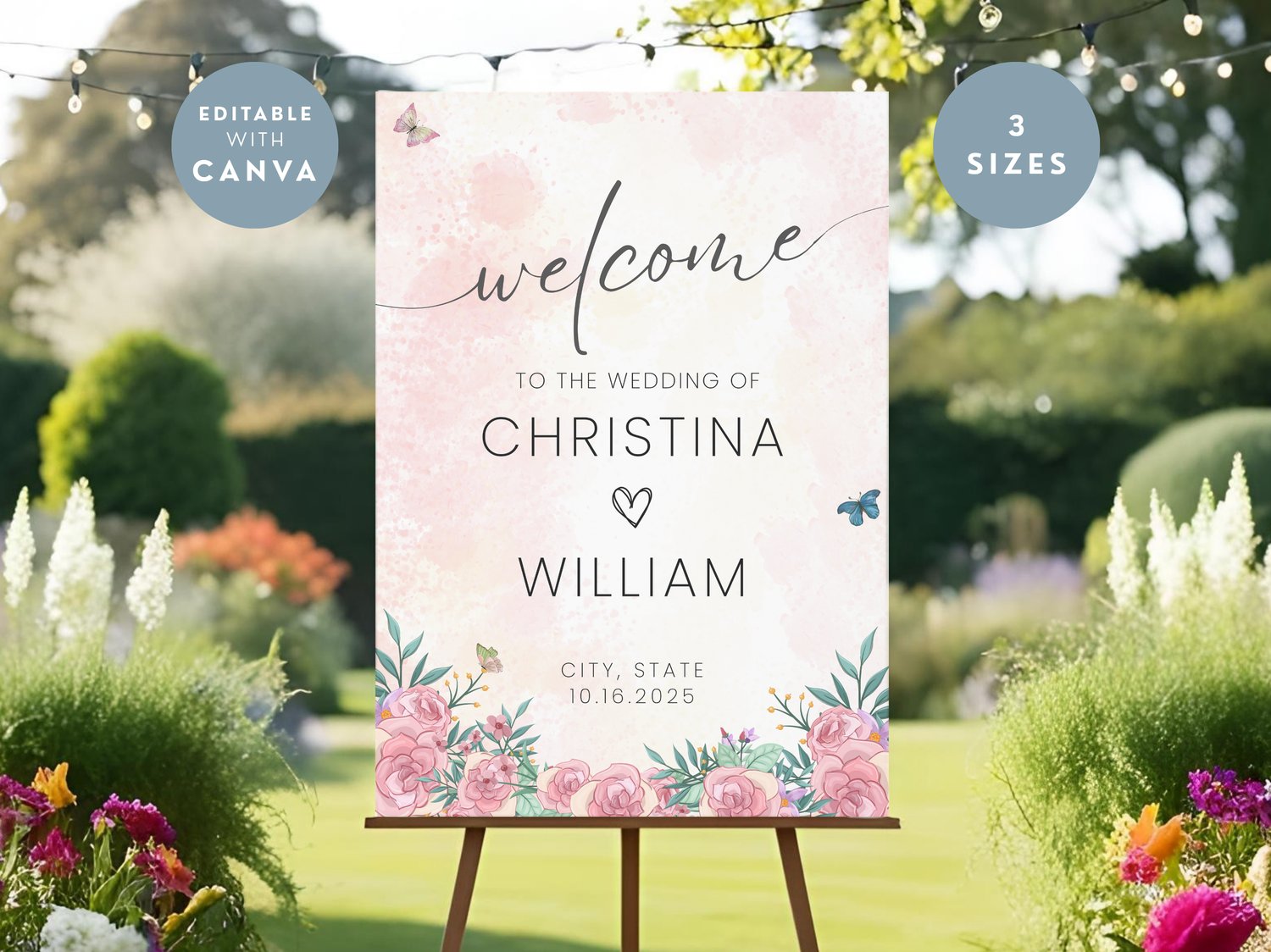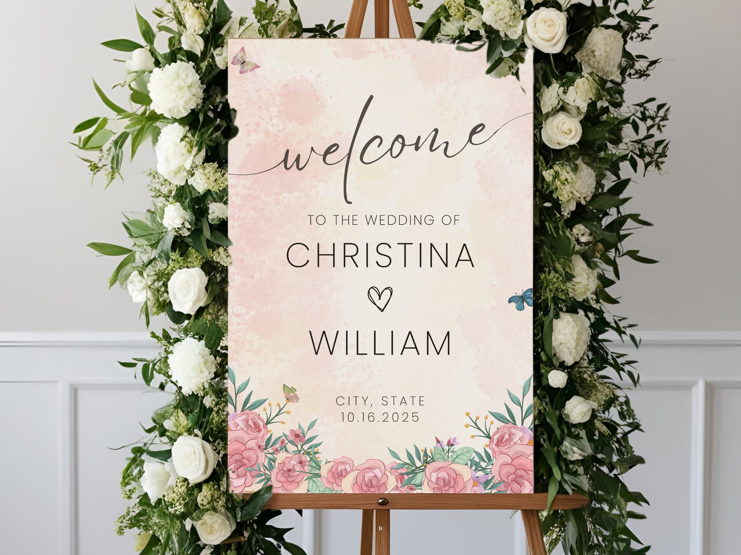 Spring Wedding Welcome Sign With Rose Pink Floral Theme For Elegant Venue Entrance Custom Printable Butterfly Design For Reception Decor 003
