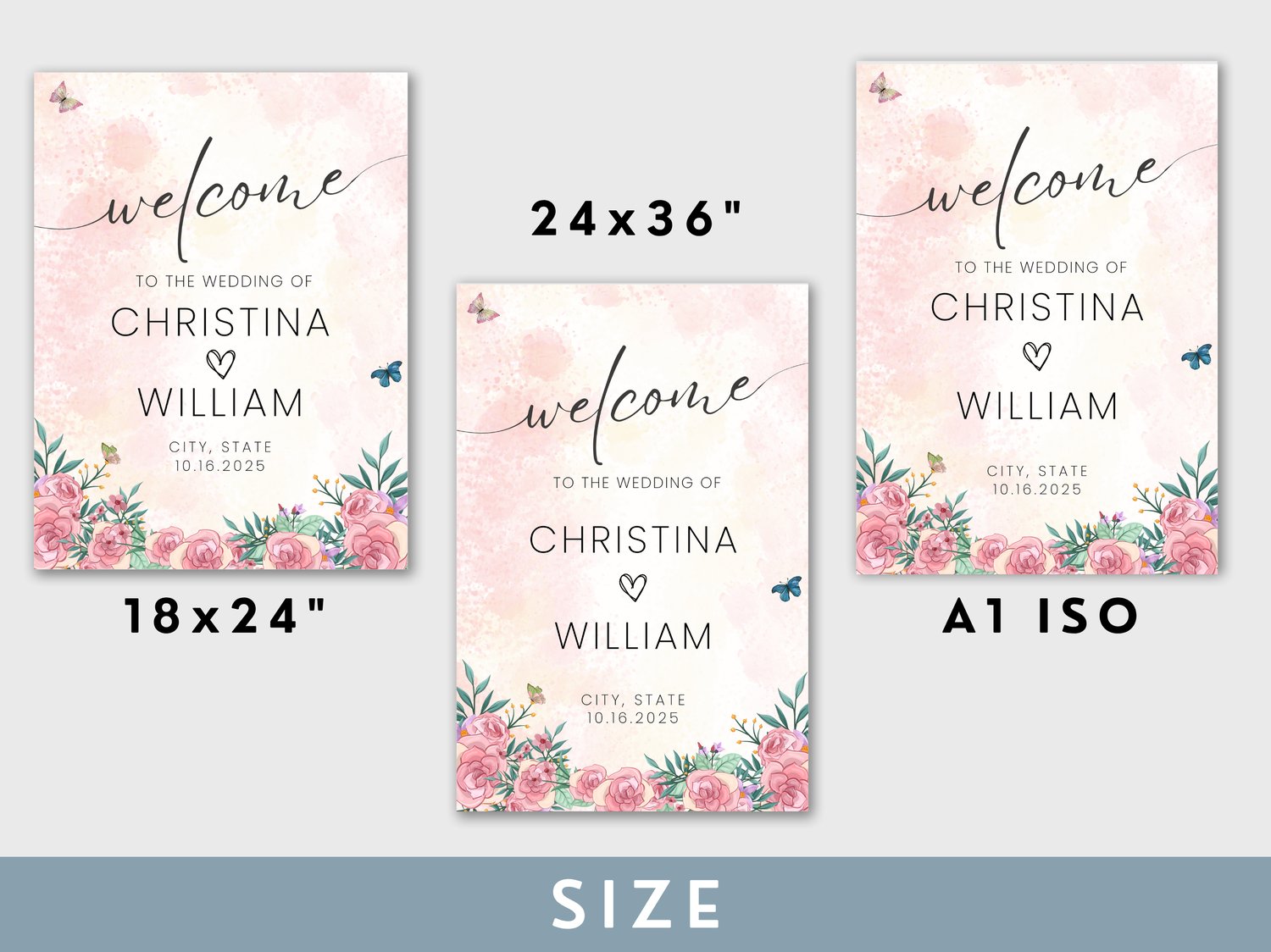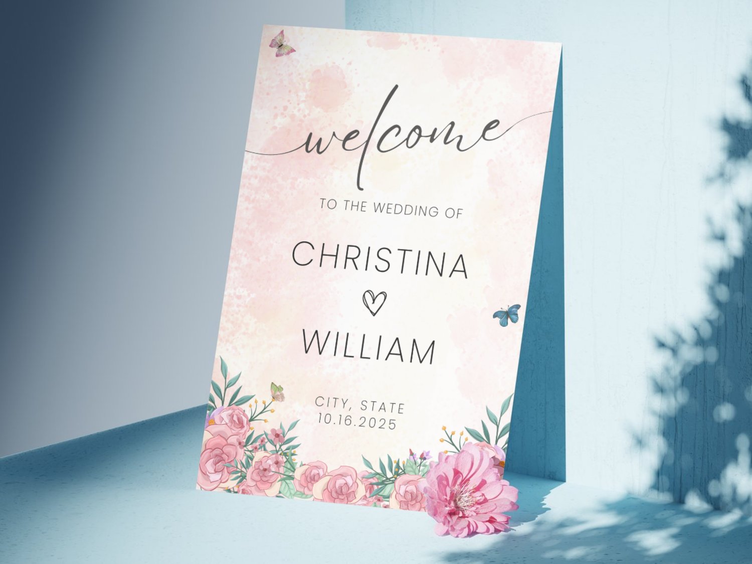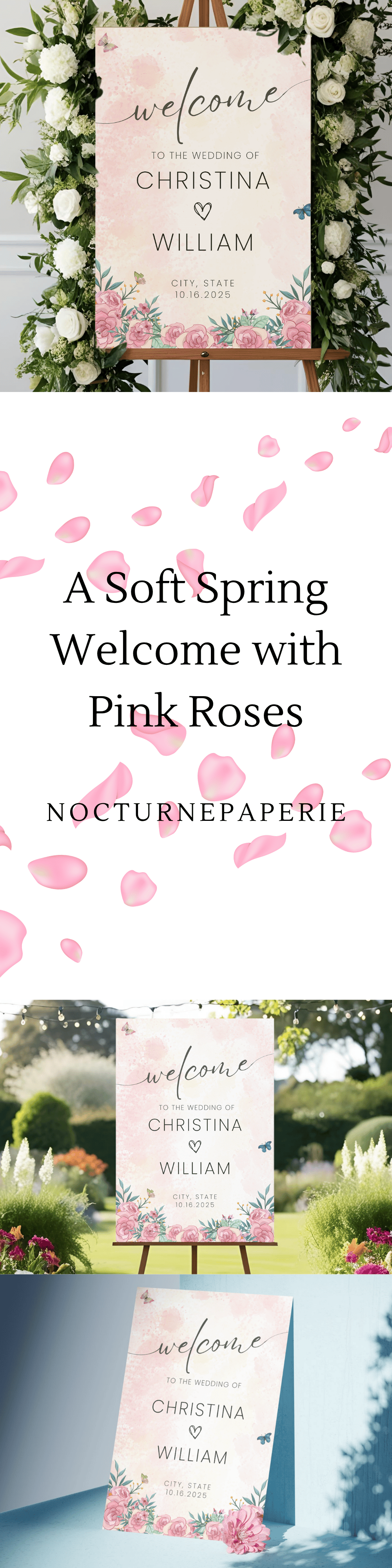 Welcome guests to your spring wedding with this rose pink floral themed welcome sign. This custom printable butterfly sign adds an elegant touch to your wedding entrance and reception decor. It’s part of our seasonal collection on NocturnePaperie—explore other seasons like Winter, Summer, and Autumn.
