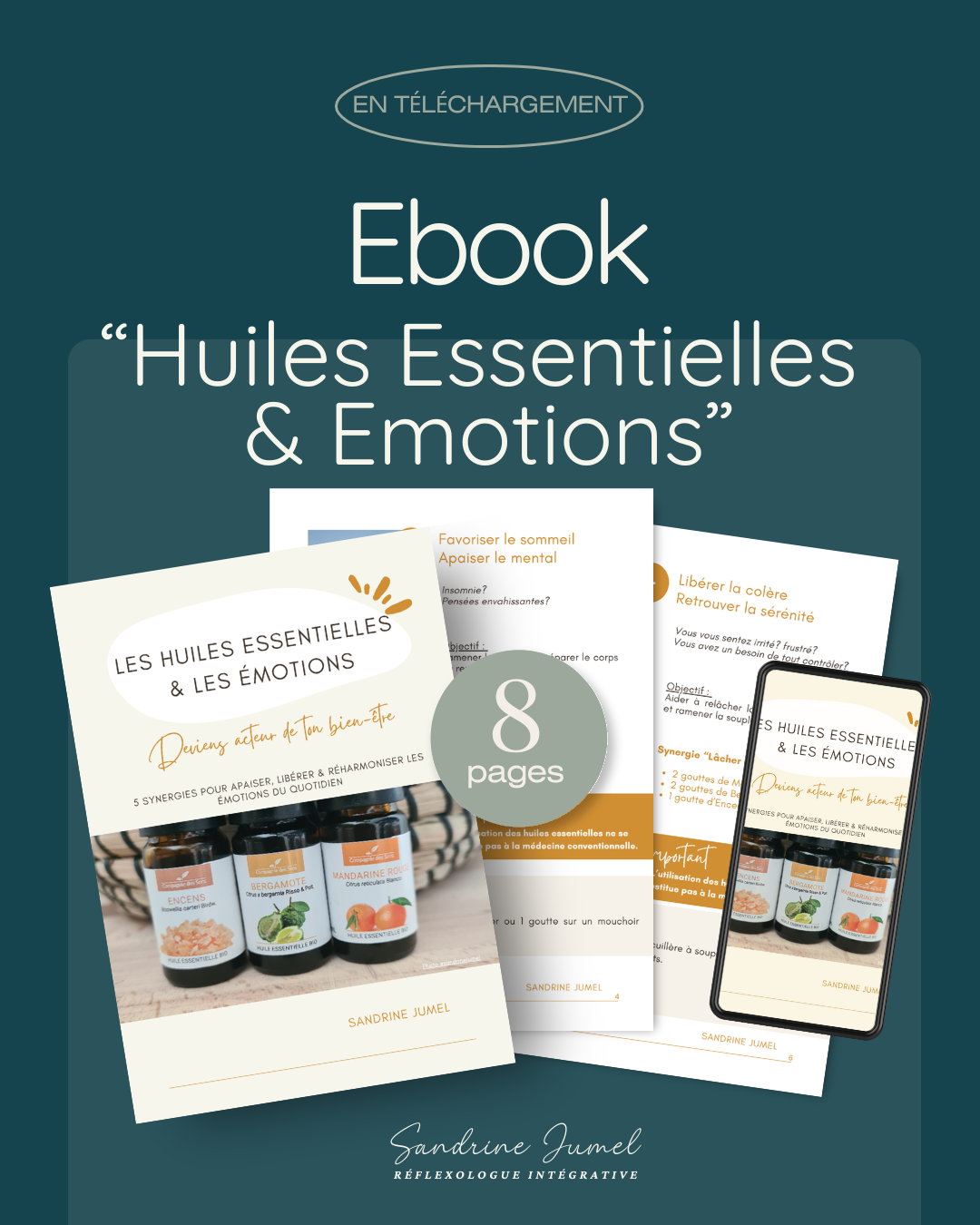En complément, découvrez également mon ebook « Réflexologie & Émotions », pour associer les synergies de cet ebook aux stimulations de zones réflexes en lien avec les 5 états émotionnels décrits dans cet ebook.