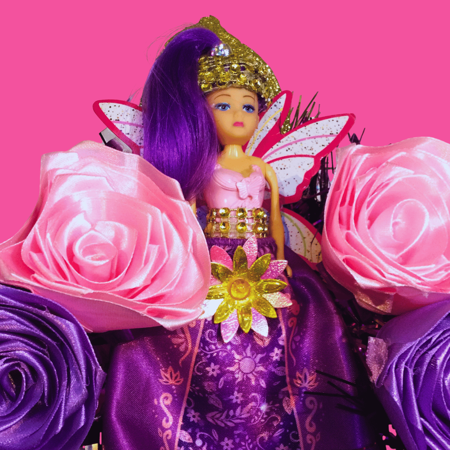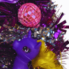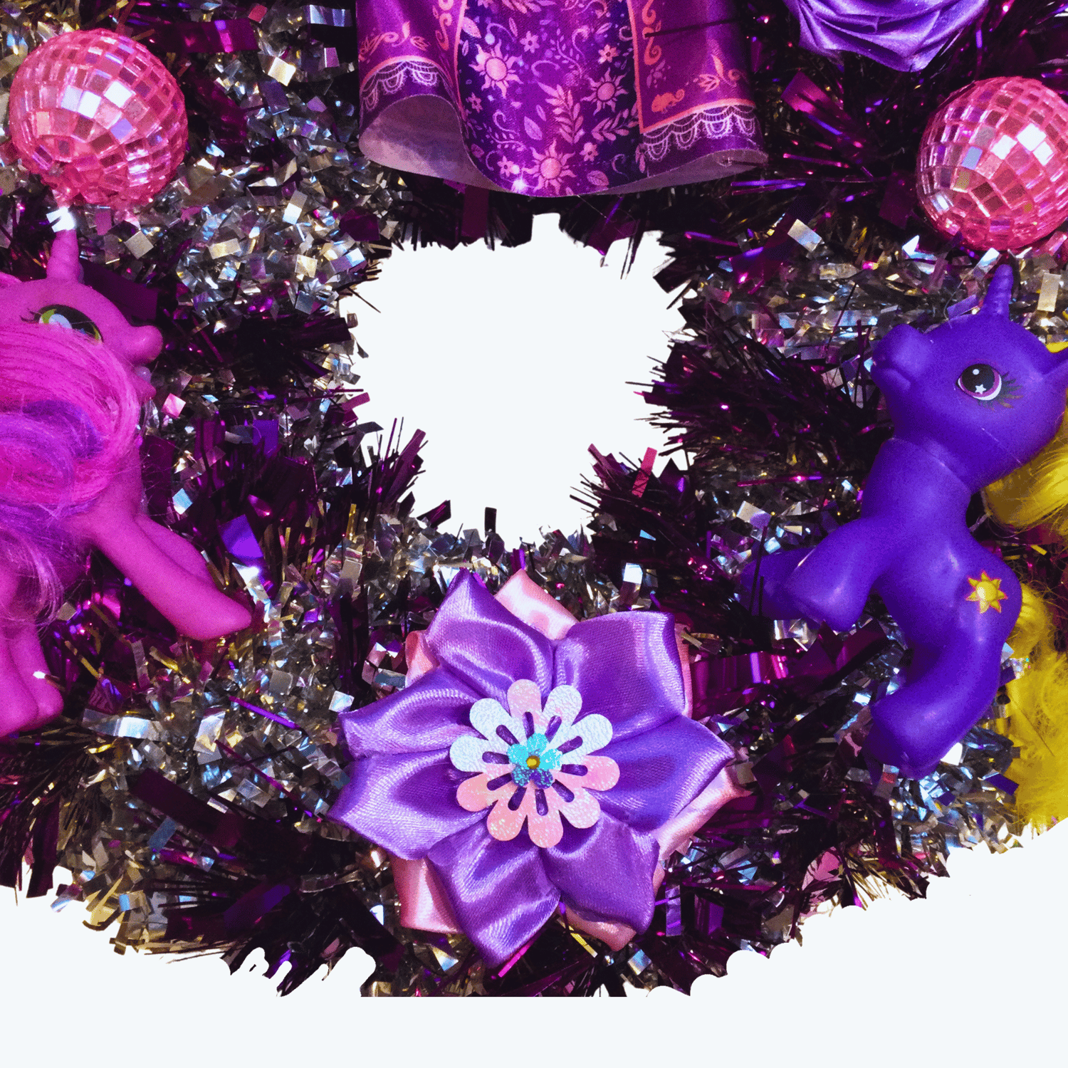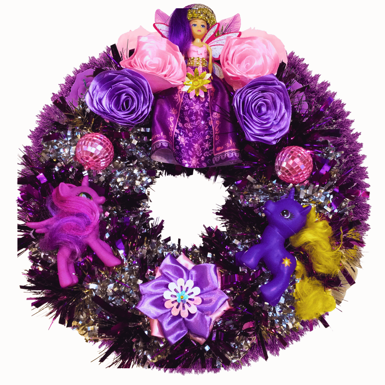 It took a while to rescue this once-downtrodden fairy princess doll and blingify her into the Bling Princess you see before you now. Hand-applied headdress, headband and flower decorations have been carefully added. Excited plastic ponies head pink glitterballs to each other on their new tinsel paddock, glad to be saved from landfill. Silk flowers gain a new purpose, too, as flowery pillows and decorations on this one-of-a-kind wreath. It's the ideal diva statement piece for a room and a great party wall feature too.