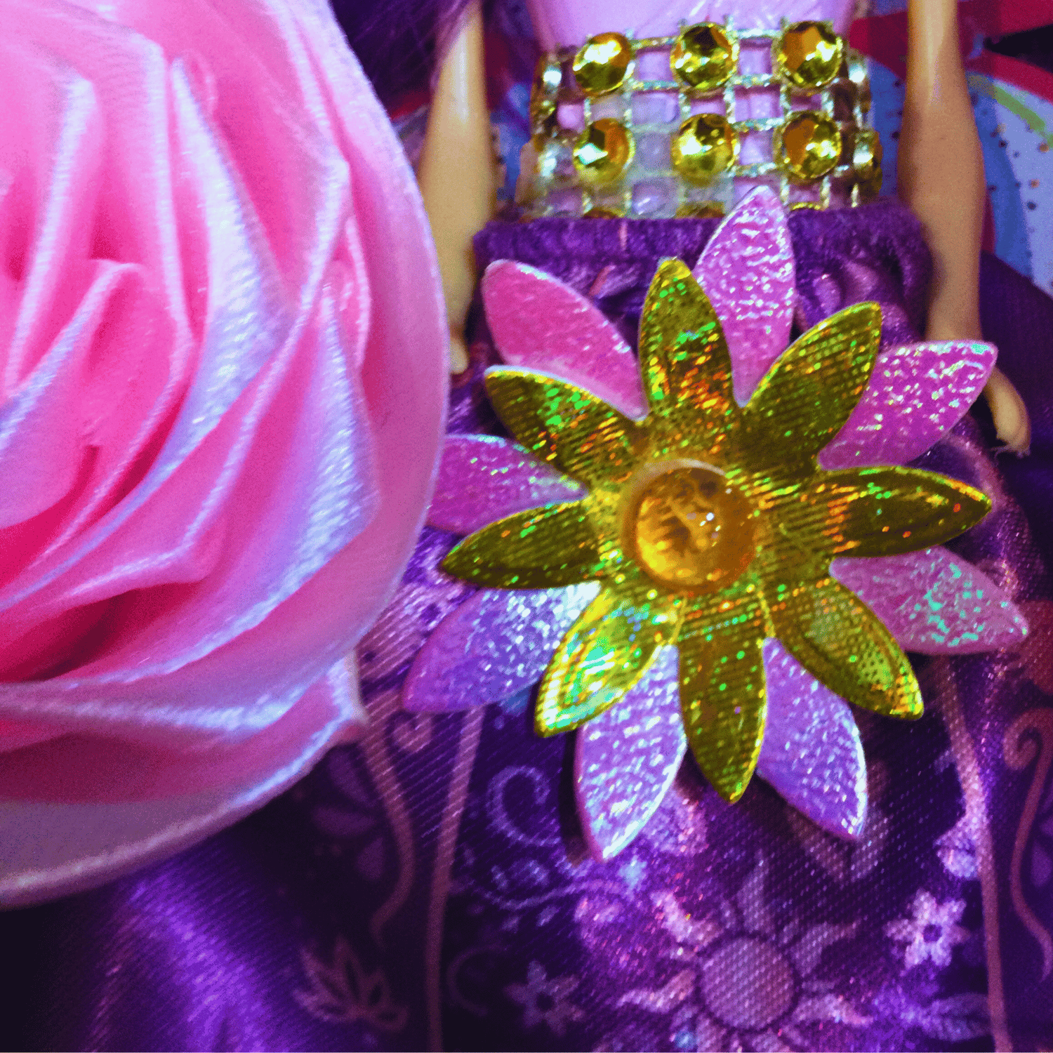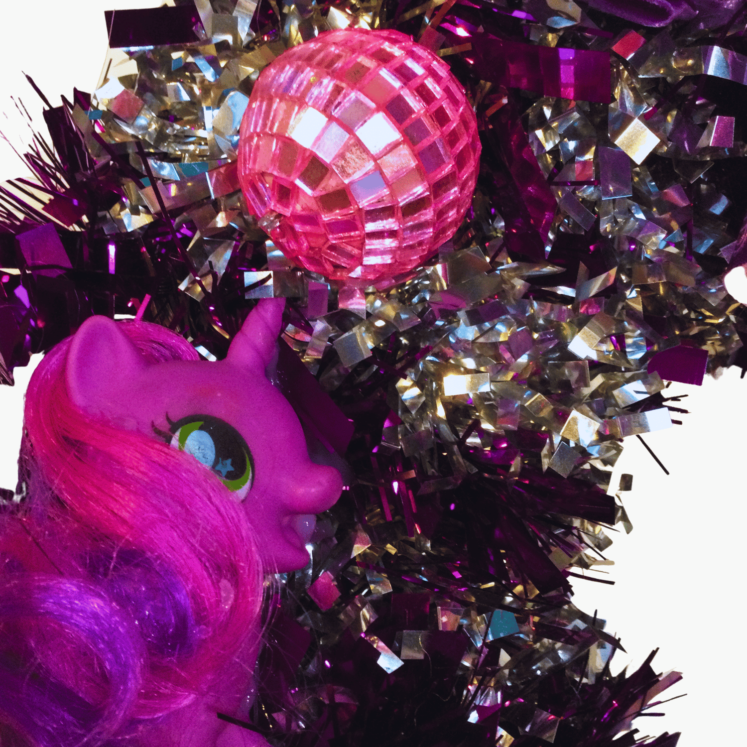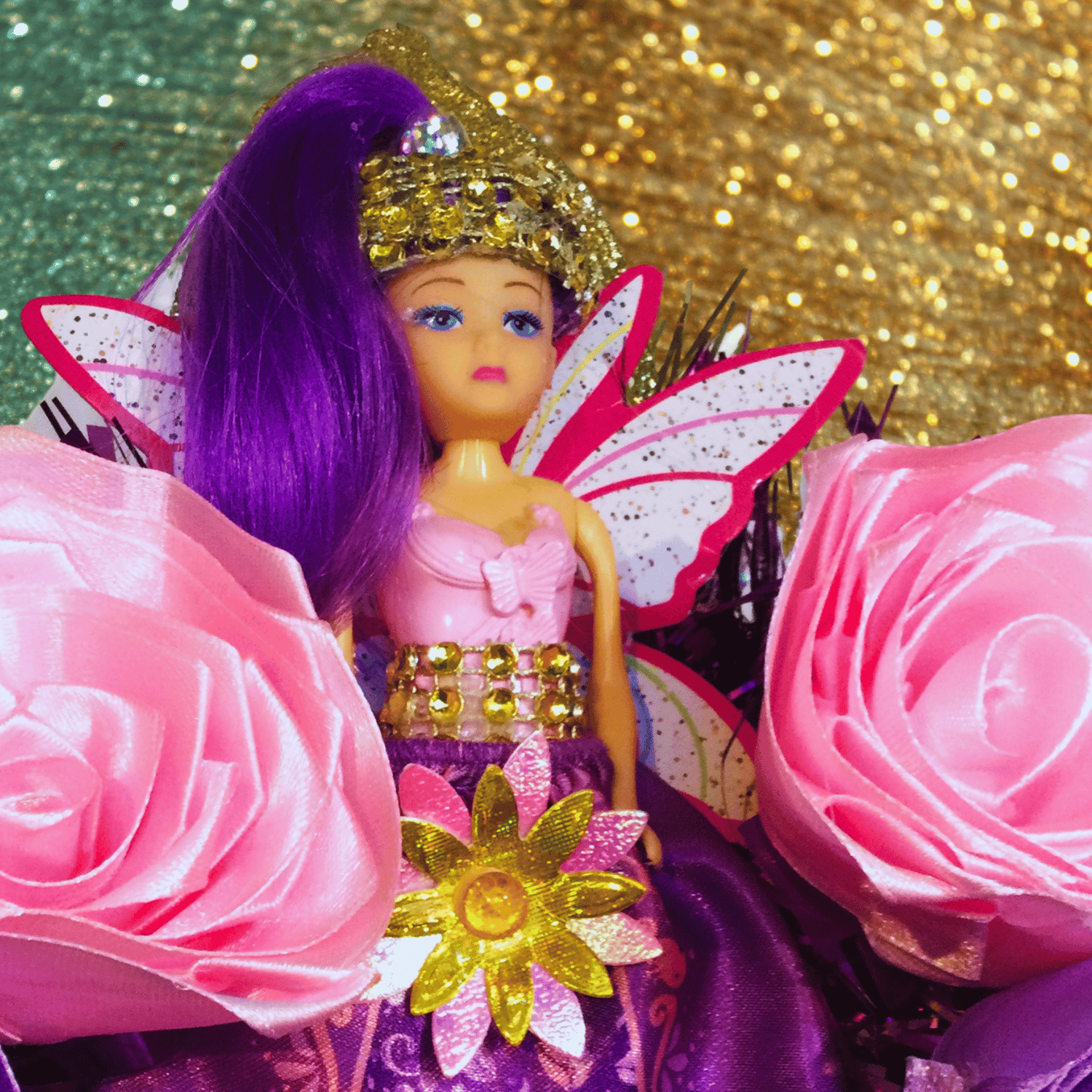 It took a while to rescue this once-downtrodden fairy princess doll and blingify her into the Bling Princess you see before you now. Hand-applied headdress, headband and flower decorations have been carefully added. Excited plastic ponies head pink glitterballs to each other on their new tinsel paddock, glad to be saved from landfill. Silk flowers gain a new purpose, too, as flowery pillows and decorations on this one-of-a-kind wreath. It's the ideal diva statement piece for a room and a great party wall feature too.