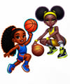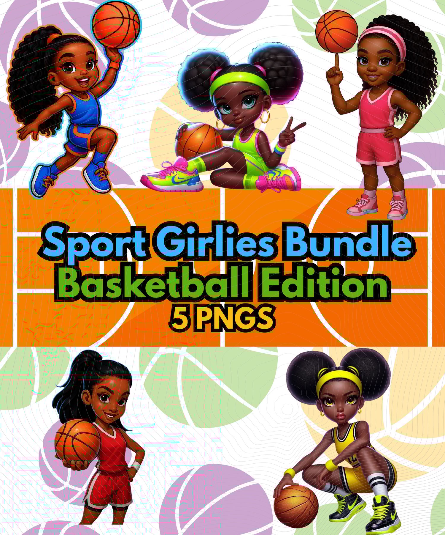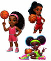 This Basketball Edition Sport Girlies Bundle features 5 bold, beautiful Black girl characters with fierce poses, fun hairstyles, and vibrant b-ball uniforms — perfect for bringing your creative projects to life.