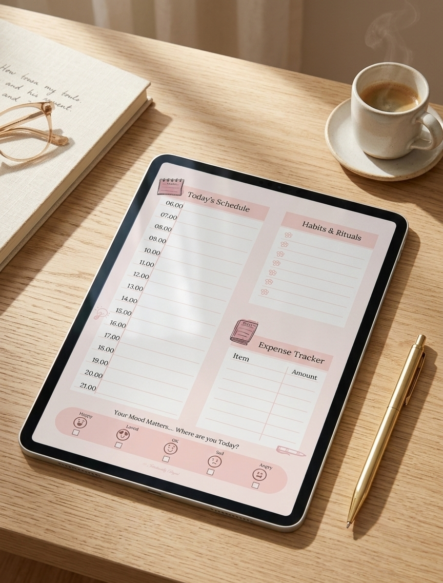 🌸 Page 2 — Schedule & Structure A time-blocked schedule from 6 am to 9 pm, a habits and rituals tracker, a daily expense log, and a mood check-in — everything you need to give your day shape and intention.