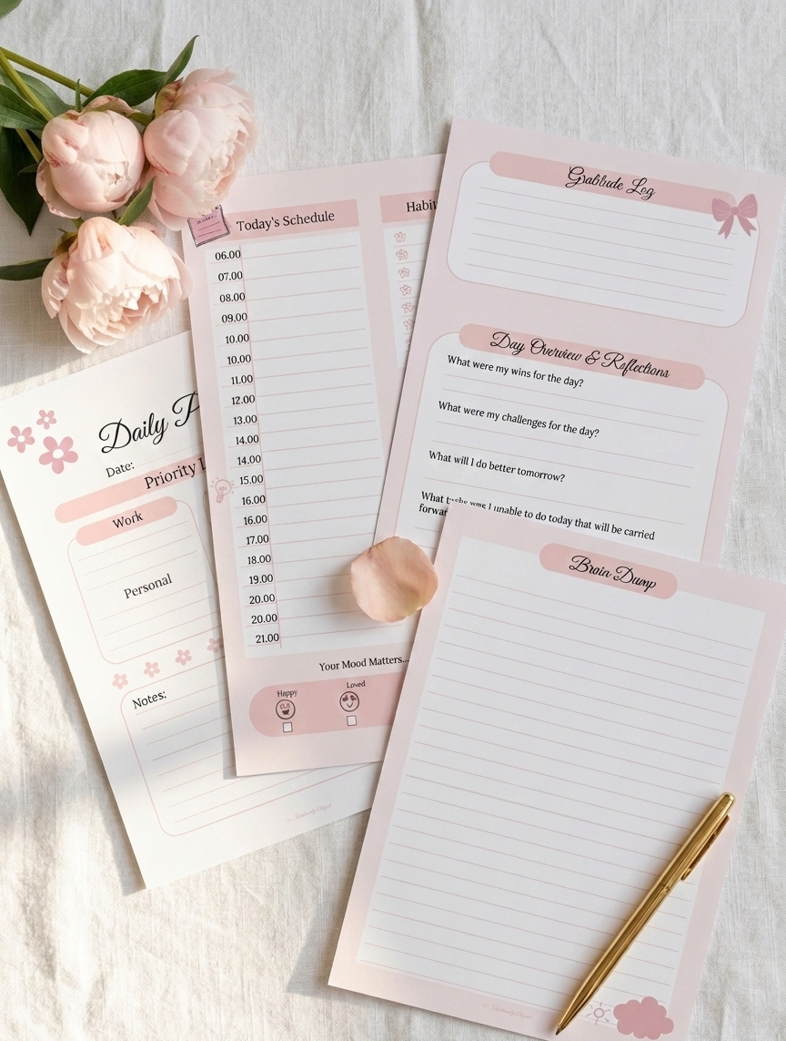 🌸 Page 3 — Reflect & Receive A gratitude log to find beauty in the ordinary, and guided reflection prompts to close your day with awareness instead of exhaustion.