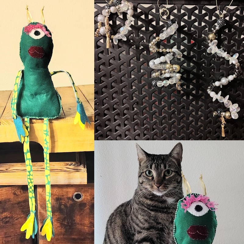Included: instructions for galaxy ornaments and Alien on a Shelf (cat is optional), patterns for Alien on a Shelf, some in progress photos.