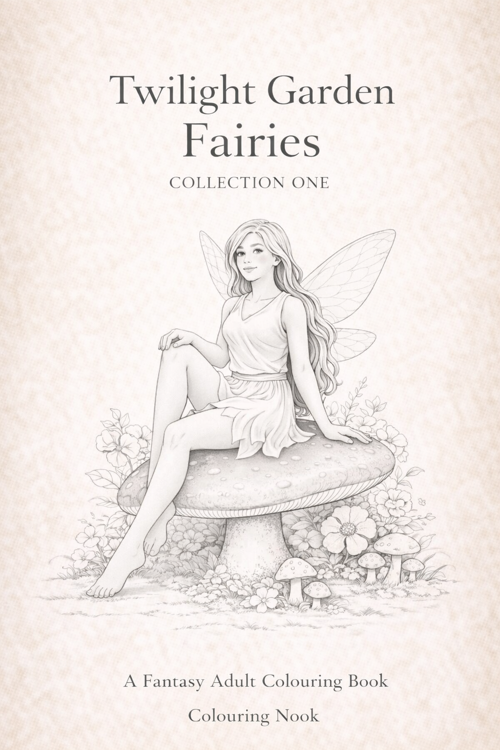 Each illustration captures a quiet twilight mood, blending sculptural fairy forms with mushrooms, flowers, and garden details to create a calm, magical colouring experience.