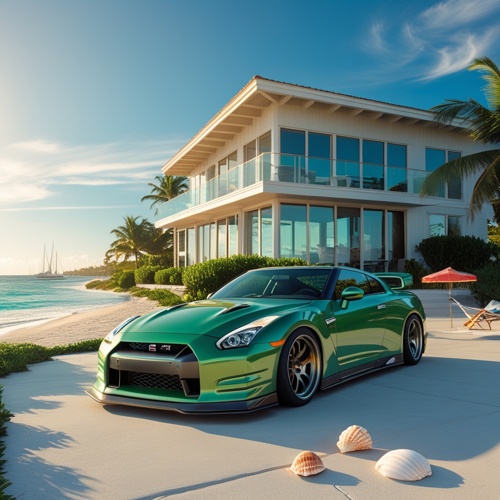 A stunning, modern beach house with large windows, sliding glass doors, and a slightly pitched roof, surrounded by lush greenery and palm trees, situated directly on the shoreline with the turquoise ocean waters and sailboats in the background, featuring a sleek, green Nissan GTR with gleaming metal accents and sporty rims parked prominently in the driveway, casting a subtle shadow on the light-gray concrete pavement, with a few seashells and beach towels scattered nearby, under a clear blue sky with a few wispy clouds, with the warm sunlight casting a golden glow on the entire scene.