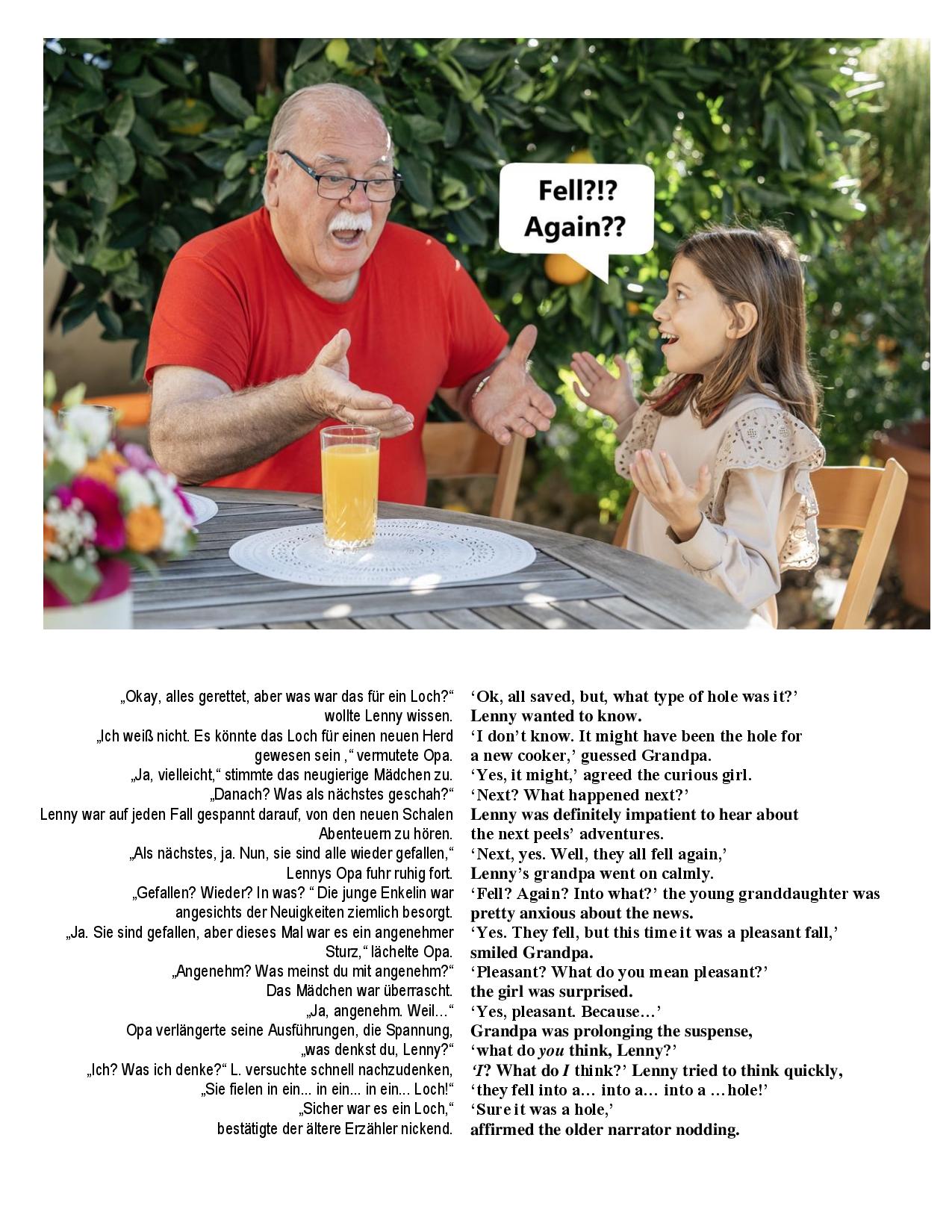 - Der Erzählteil ist etwa 10 Seiten lang, mit den Illustrationen im oberen Teil und dem Text in der unteren Hälfte;