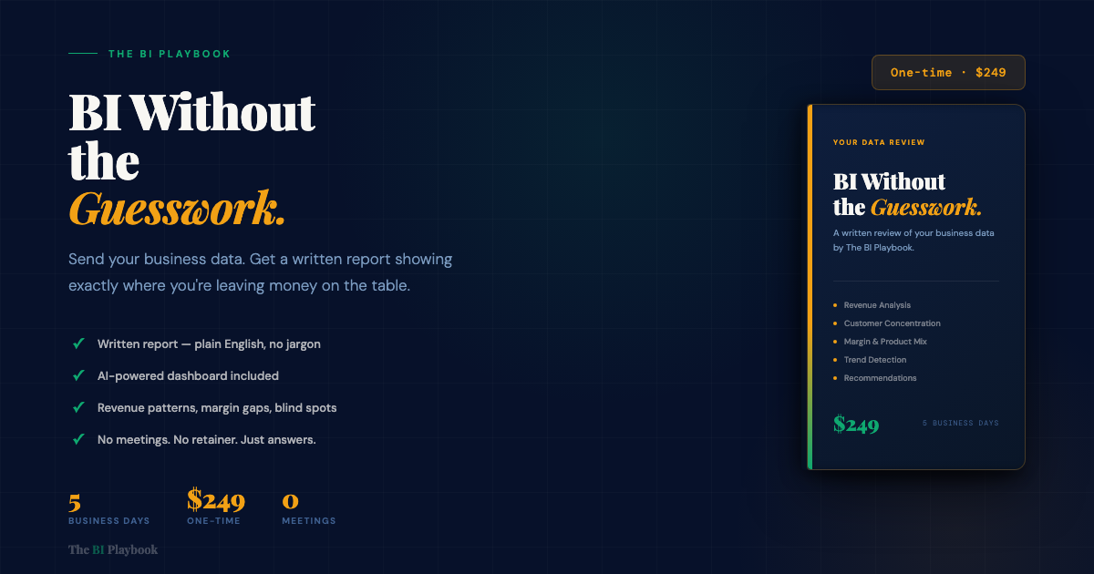 A written review of your business data. Send your data, get a report showing exactly where you're leaving money on the table. Delivered in 5 business days.